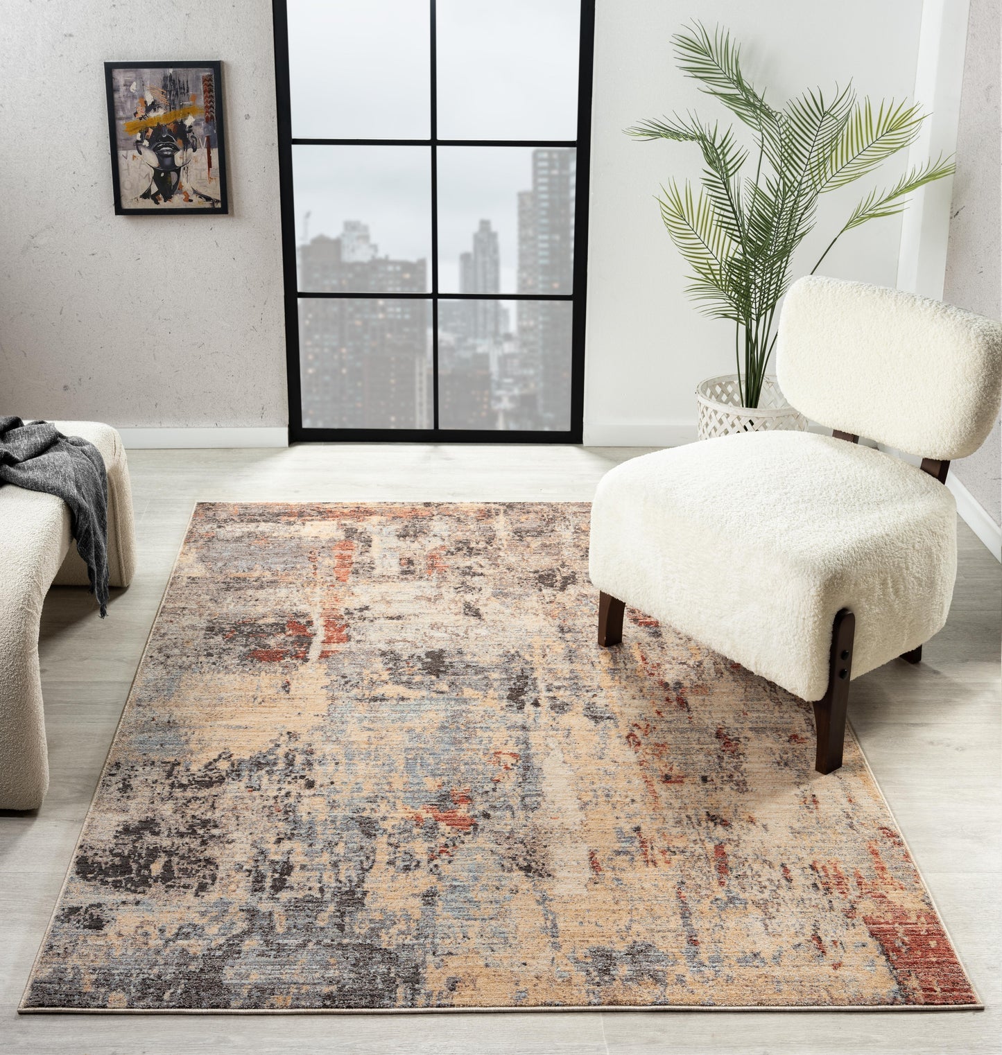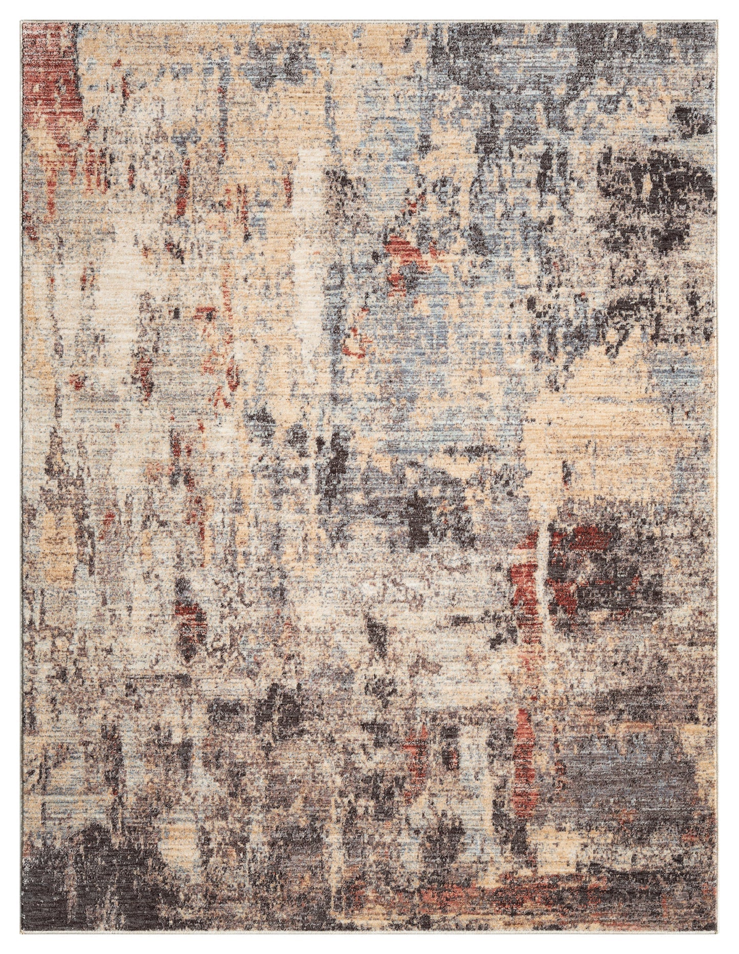 Featuring a dynamic mix of anthracite, soft rose, beige, and muted blue, this rug brings an artistic, painterly feel to your space. The distressed, weathered finish adds depth and texture, giving it a unique character that feels both contemporary and timeless.