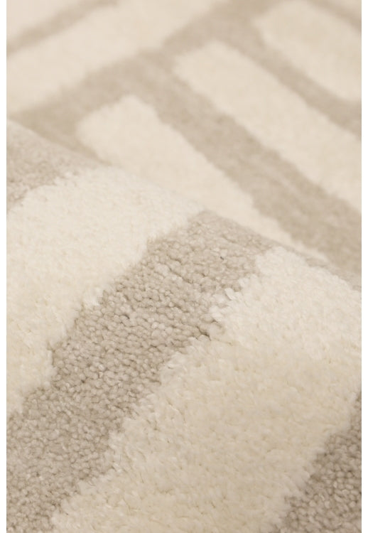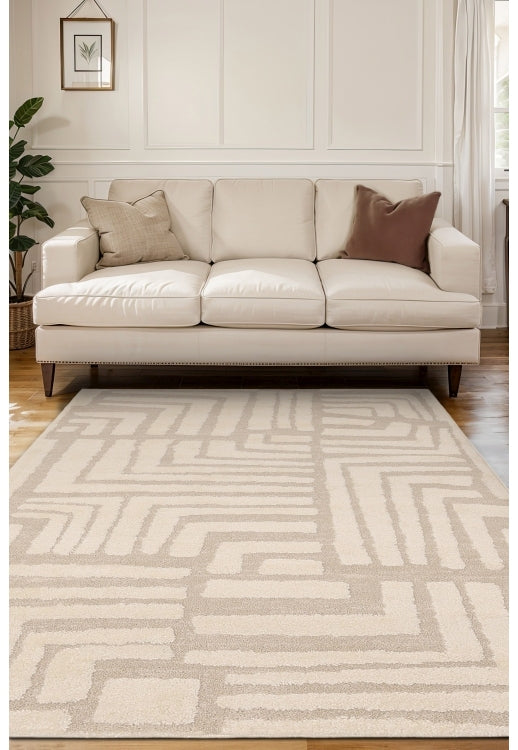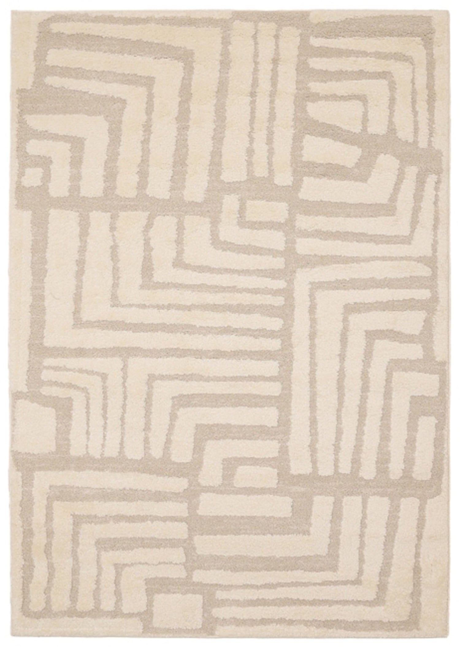 Featuring an abstract maze-like pattern in soft cream and beige tones, this rug adds depth and dimension with its high-low pile, offering a tactile and stylish finish.