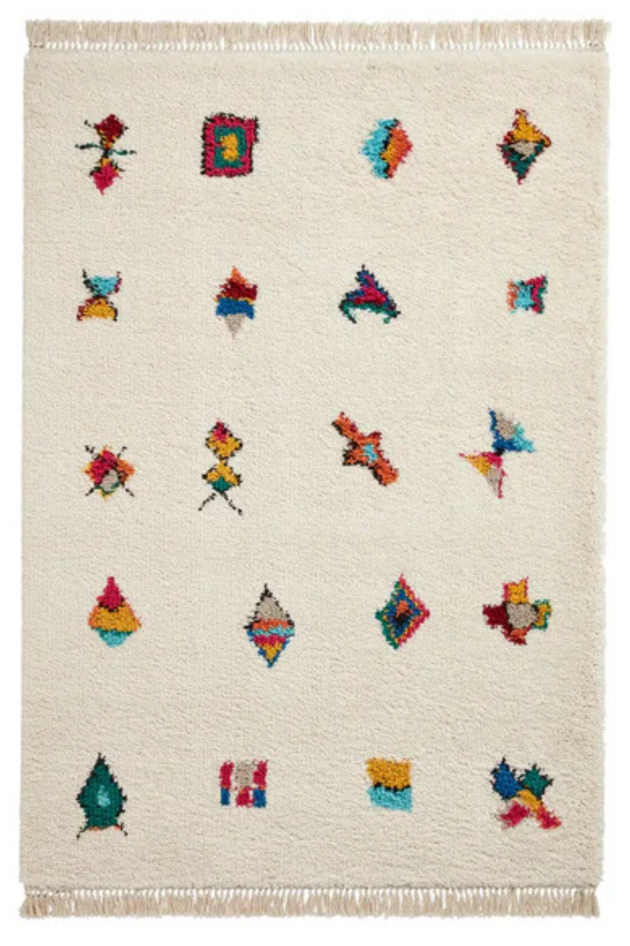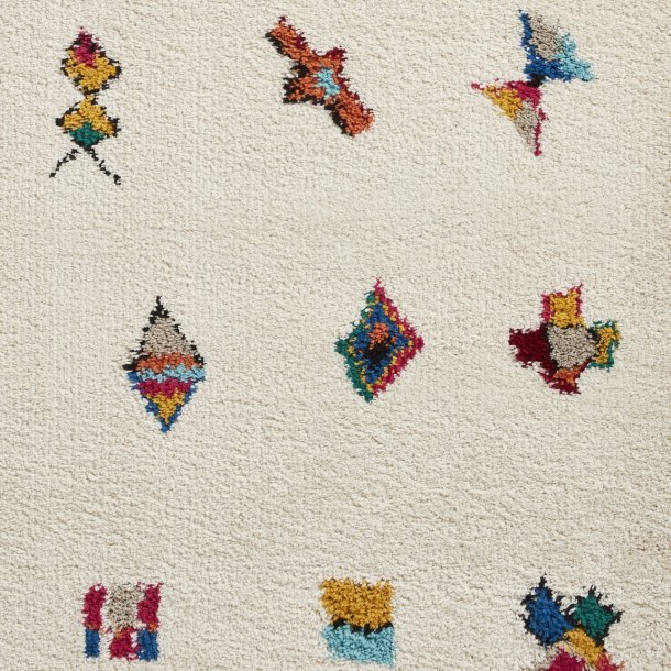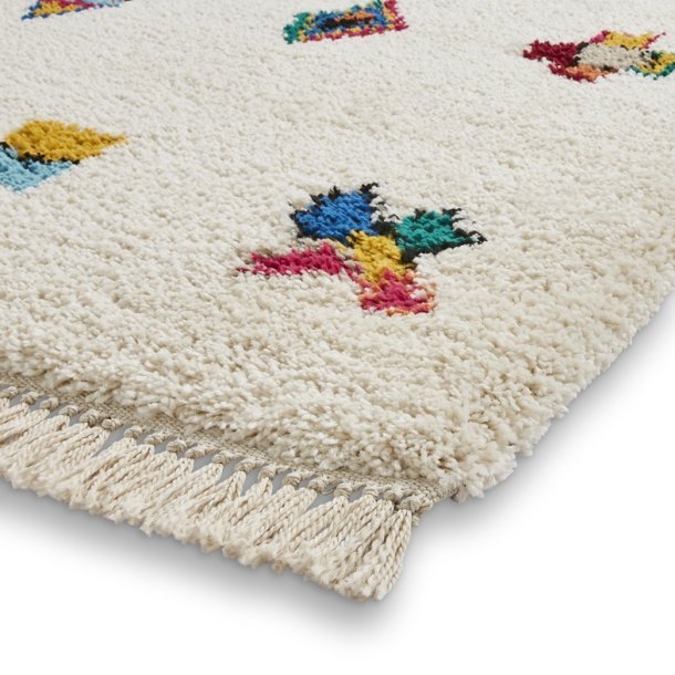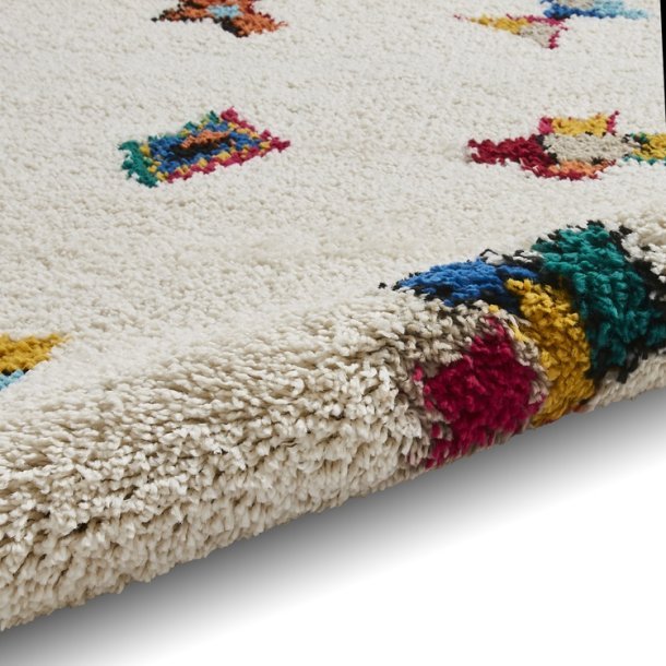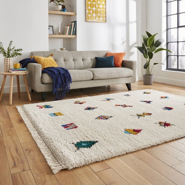 The Boho A808 Multi Rug is a modern take on Moroccan-inspired design, offering a fresh and playful touch to any room. Its soft cream base is adorned with a scattering of colourful geometric motifs, adding vibrant pops of red, blue, yellow, and green. These abstract shapes lend a subtle nod to traditional Moroccan artistry while maintaining a contemporary feel.