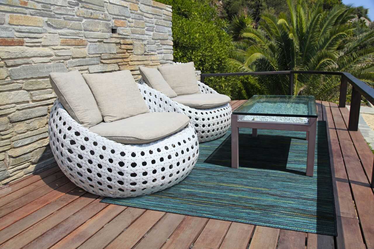 Machine-woven using renewable energy, this flatwoven rug includes an anti-slip backing for added stability. The tonal blues bring a refreshing, coastal-inspired feel to minimalist patios, modern dining areas or contemporary garden rooms.