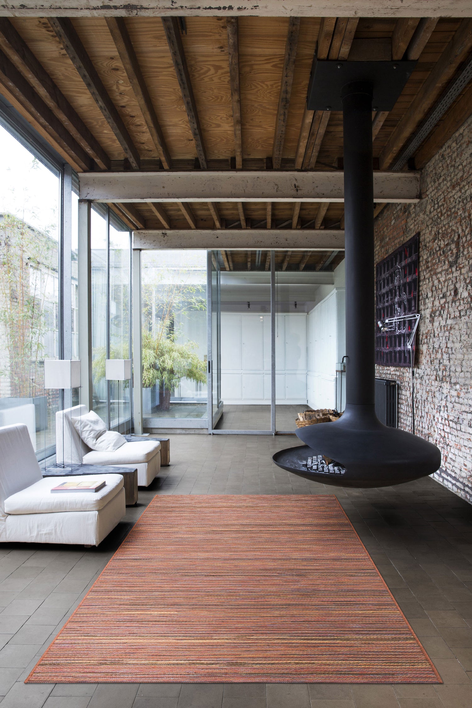 Machine-woven using renewable energy and finished with an anti-slip backing, this flatwoven rug is suitable for both indoor and outdoor spaces. Its rich palette makes it an ideal match for terracotta planters, wooden decking, or autumnal colour schemes.