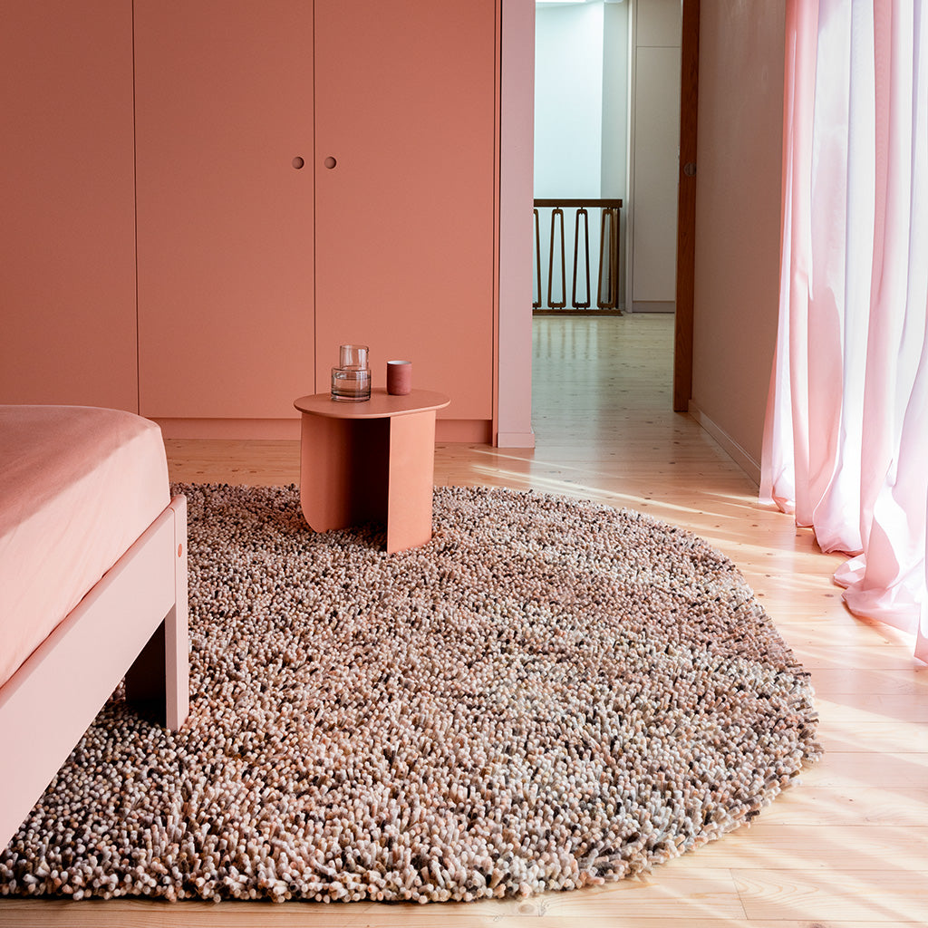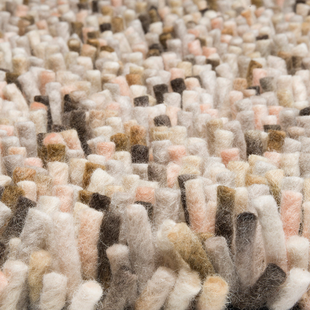 Soft, sun-warmed tones define the Dots Desert rug by Brink & Campman. Its richly textured surface is woven with clusters of woollen tufts in sandy beige, stone, and blush undertones, evoking the natural hues of desert landscapes and soft morning light.