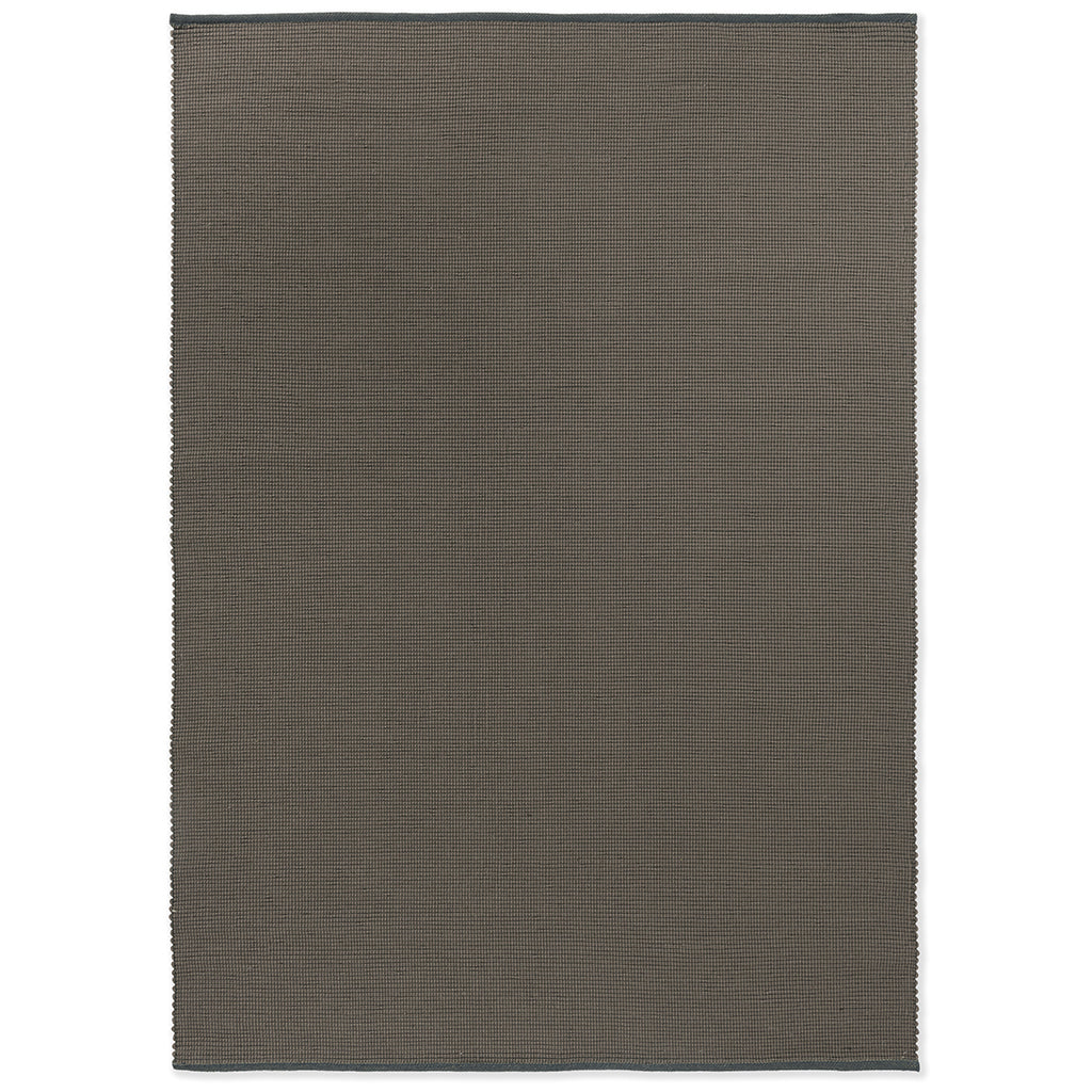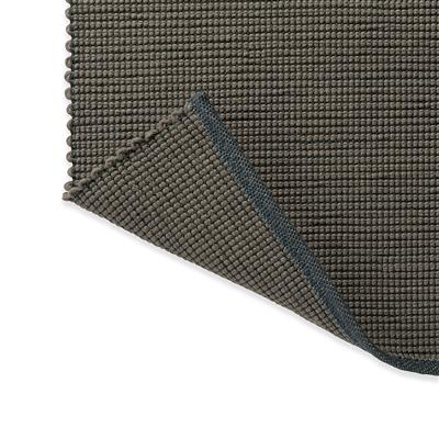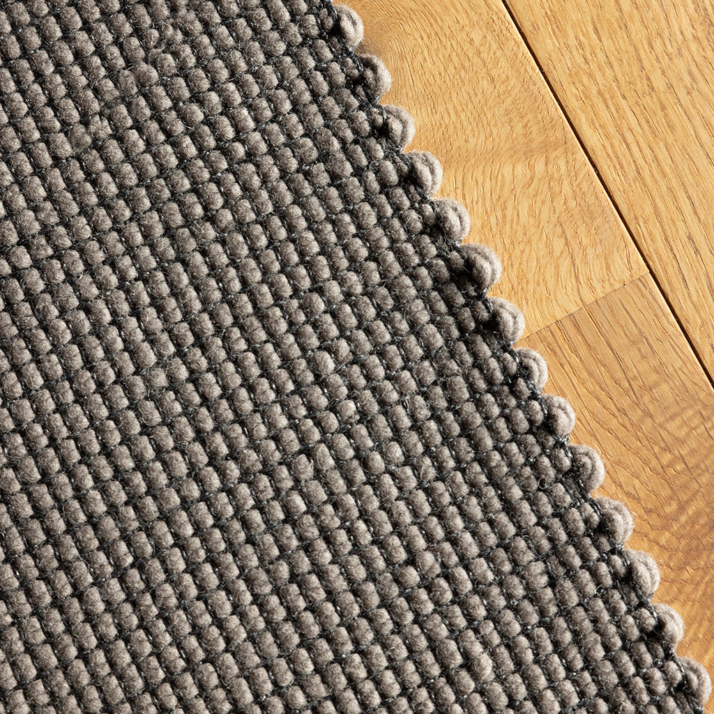 Hand-woven from pure new wool, this reversible design showcases a finely textured surface in a soft stone grey, framed with a subtle blue edge that adds just a hint of contrast.
