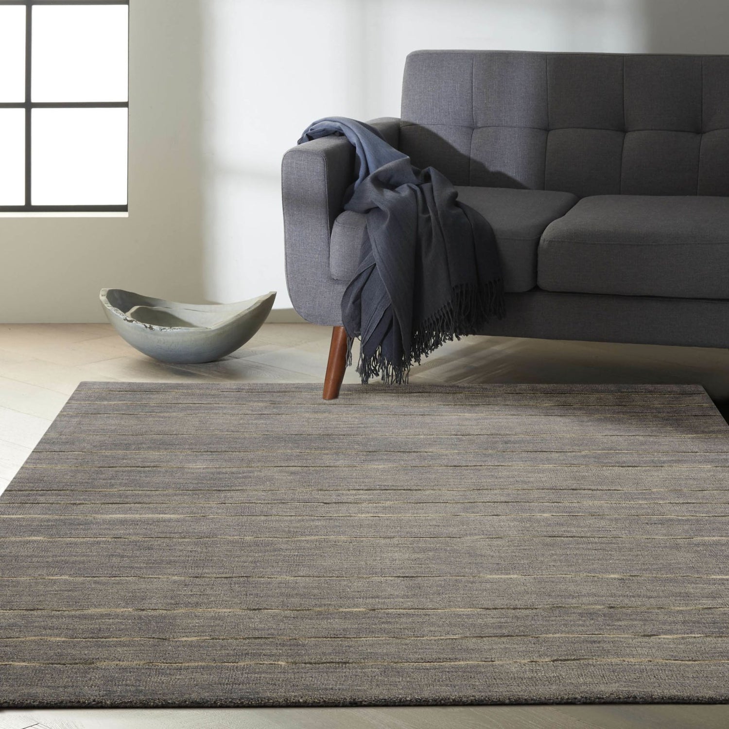 Natural, calming and modern. The Calvin Klein Halo Collection brings a grounded feeling to the contemporary home. Each rug is handmade of space-dyed wool yarns in cool neutral tones. These low-profile, minimalist rugs add an effortlessly polished touch in any space.