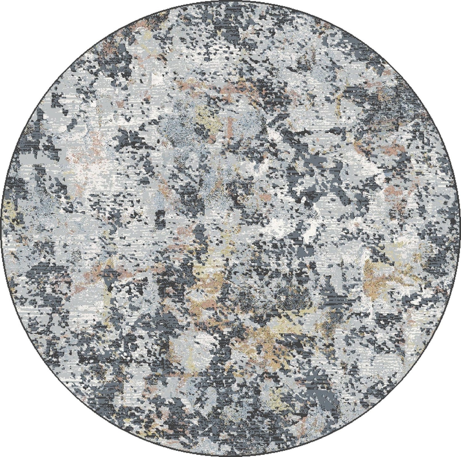 The Canyon 52023-3616 round rug makes a bold statement with its richly layered abstract design in charcoal grey, ivory, gold, peach, and muted blue. The high-contrast palette and expressive texture give it a dramatic, artistic edge, while the circular shape introduces softness and balance to structured spaces. The distressed finish adds depth, making the rug feel like a contemporary take on aged stone or weathered paint.