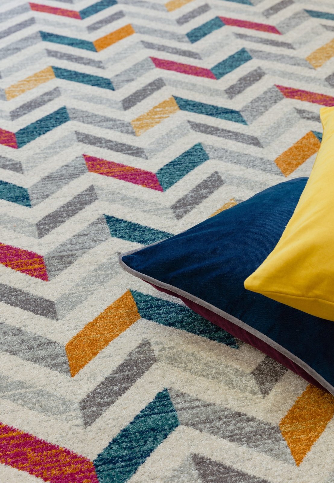 A combination of modern classics and bold geometrics in a fresh colour pallette woven from easy clean polypropylene.