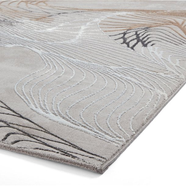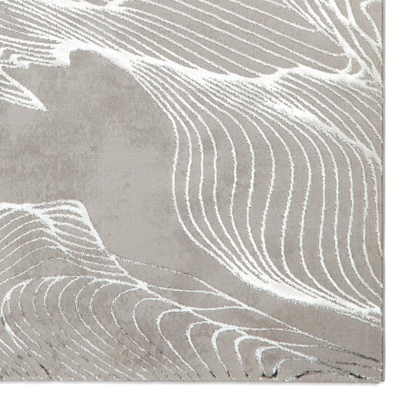 With its abstract flowing lines in ivory, black, and soft brown hues against a refined grey background, this rug evokes a sense of movement and tranquillity. The intricate detailing and delicate texture create visual interest, while the neutral palette ensures it complements a range of interiors.