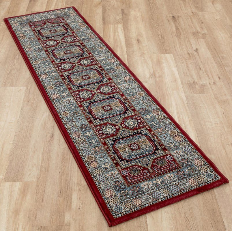 This runner showcases a bold combination of deep reds, blues, and earthy tones, woven into a striking geometric pattern inspired by traditional tribal designs. The detailed motifs and borders provide a sense of history and character, making this rug a unique and eye-catching piece for your home. Machine-made from durable polypropylene, this runner is designed for resilience, offering a soft feel underfoot while withstanding everyday use.