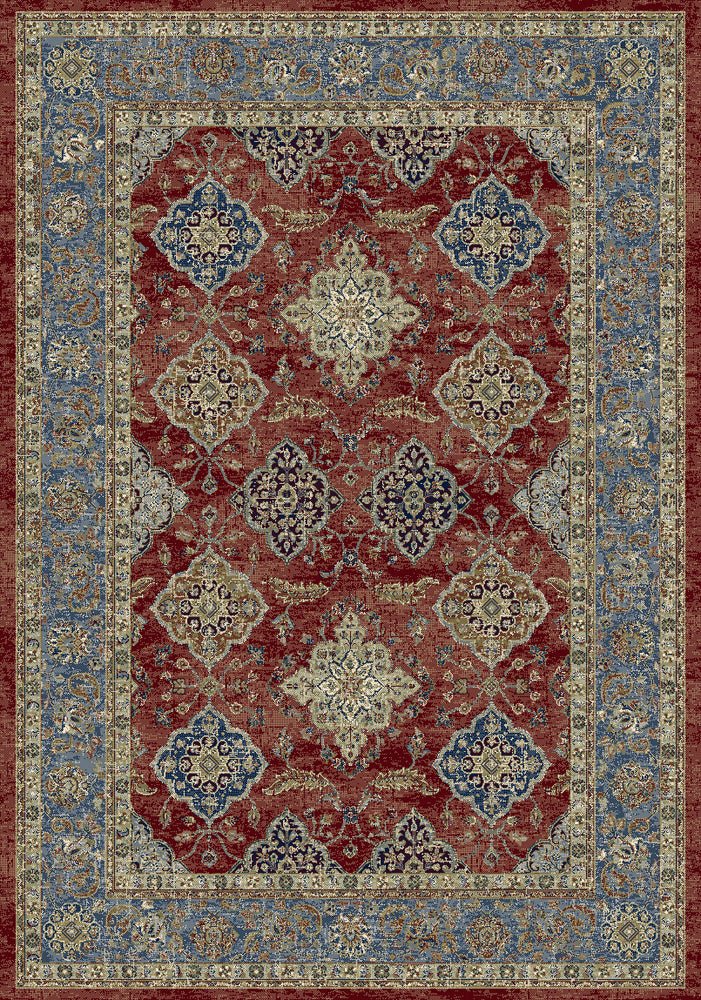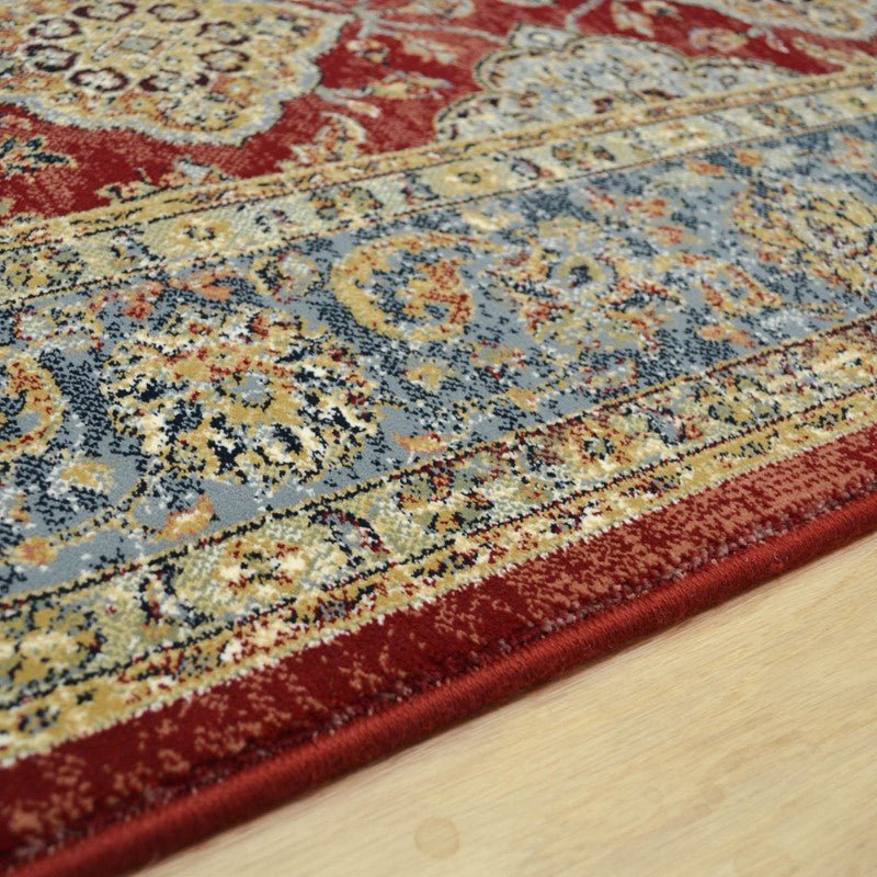 This rug showcases a beautiful combination of deep reds and blues, complemented by earthy tones, arranged in a classic pattern with intricate medallions and a detailed border. The design is deeply rooted in the aesthetics of traditional Persian rugs, making it an ideal choice for those who appreciate timeless and sophisticated decor. Machine-made from durable polypropylene, this rug offers a soft texture underfoot while being resilient enough for daily use.