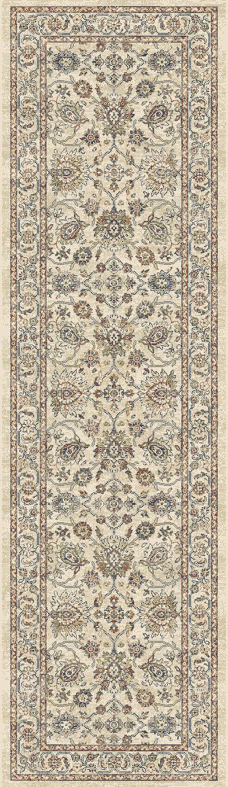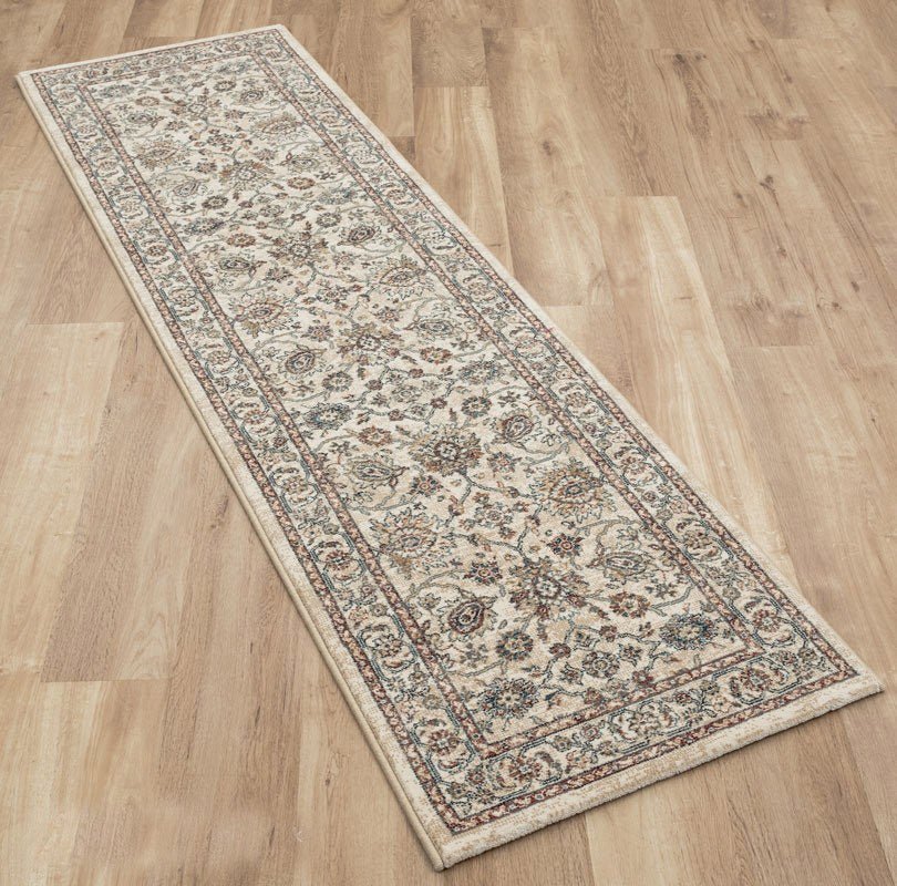 This runner rug showcases a soft cream background, intricately decorated with floral motifs in a palette of beige, blue, and warm earth tones. Drawing inspiration from traditional Persian designs, it adds a timeless and sophisticated touch to any hallway or entryway. Crafted from durable polypropylene, this rug offers both a comfortable feel underfoot and the resilience needed for high-traffic areas.