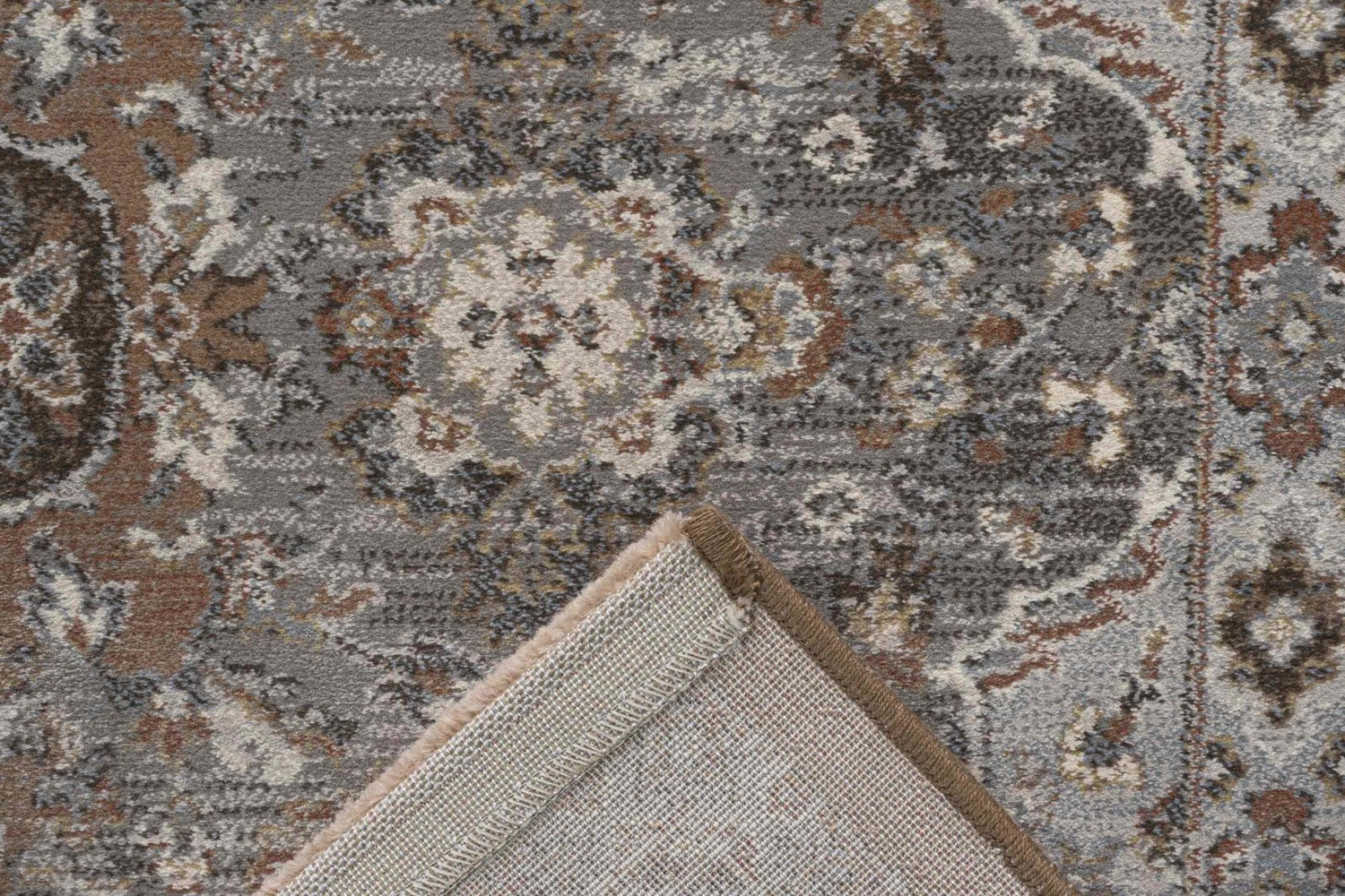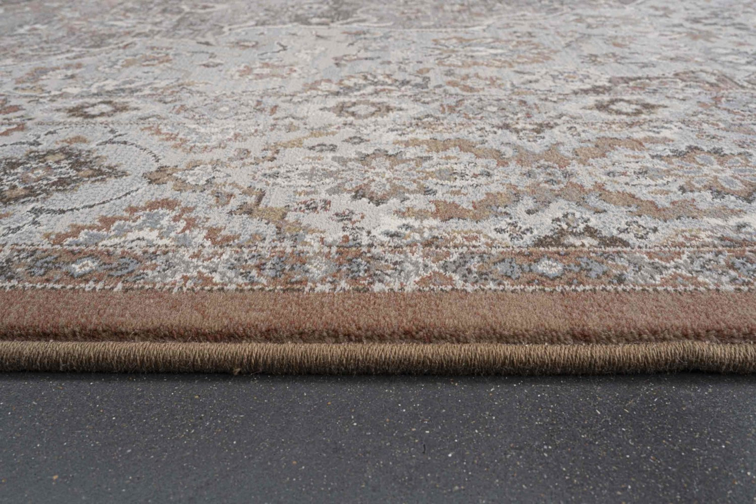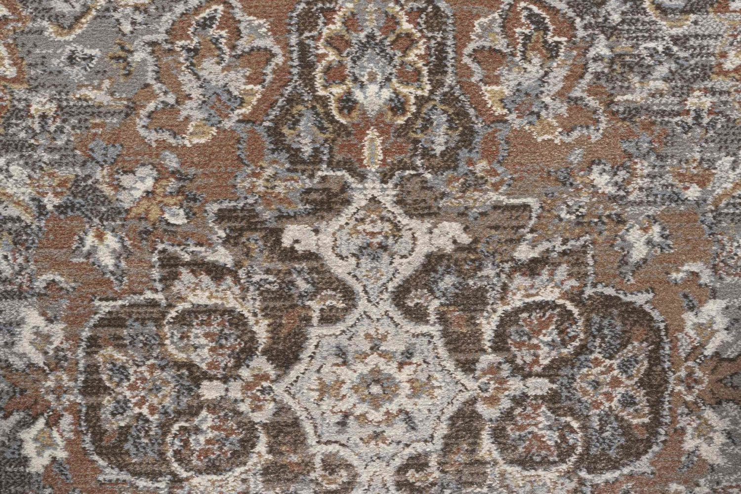 Machine-woven from polypropylene, this rug layers warm chestnut brown with silvery grey, muted gold, and off-white highlights. The distressed finish adds subtle variation across the surface, giving the pattern a lived-in, vintage effect without losing definition.