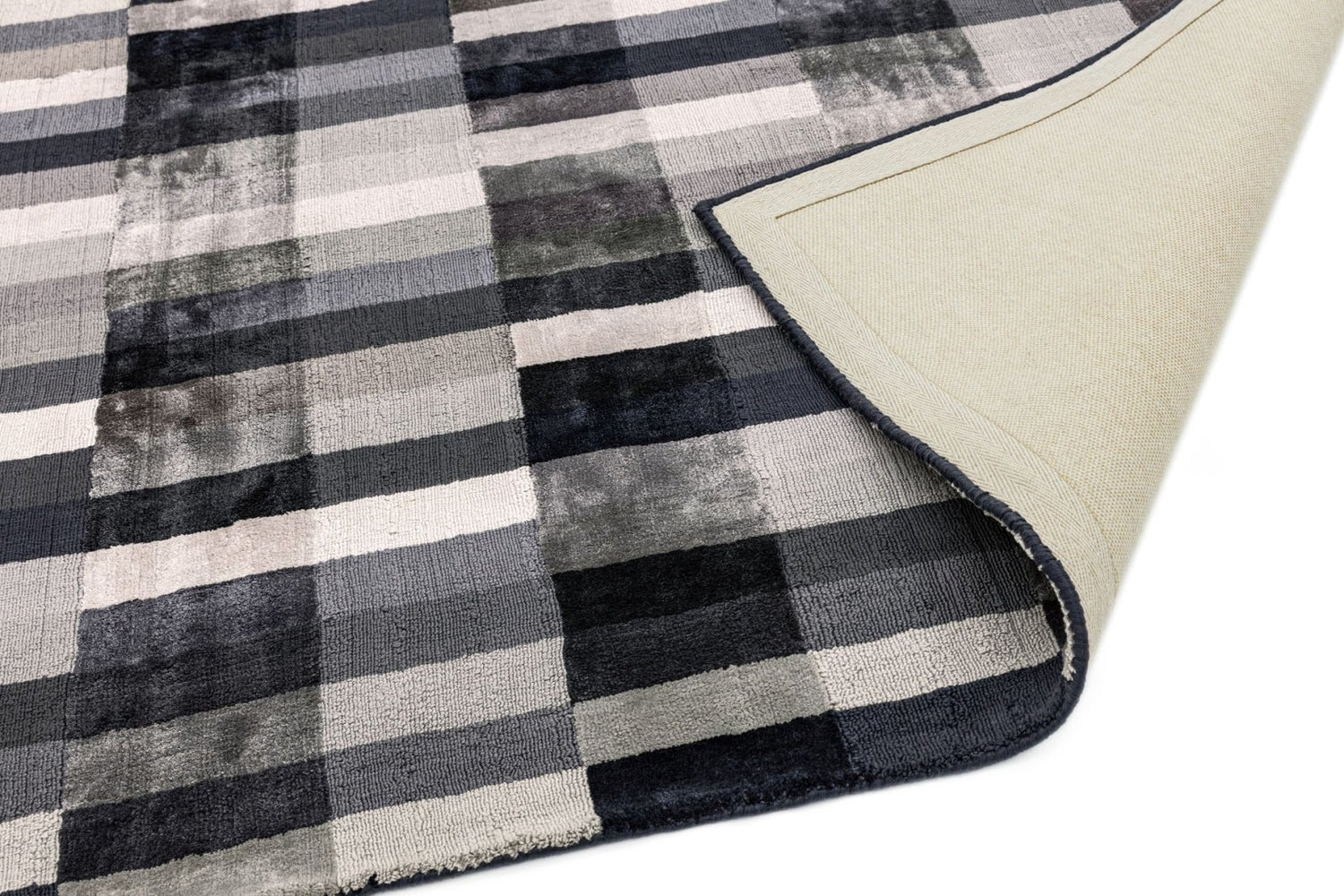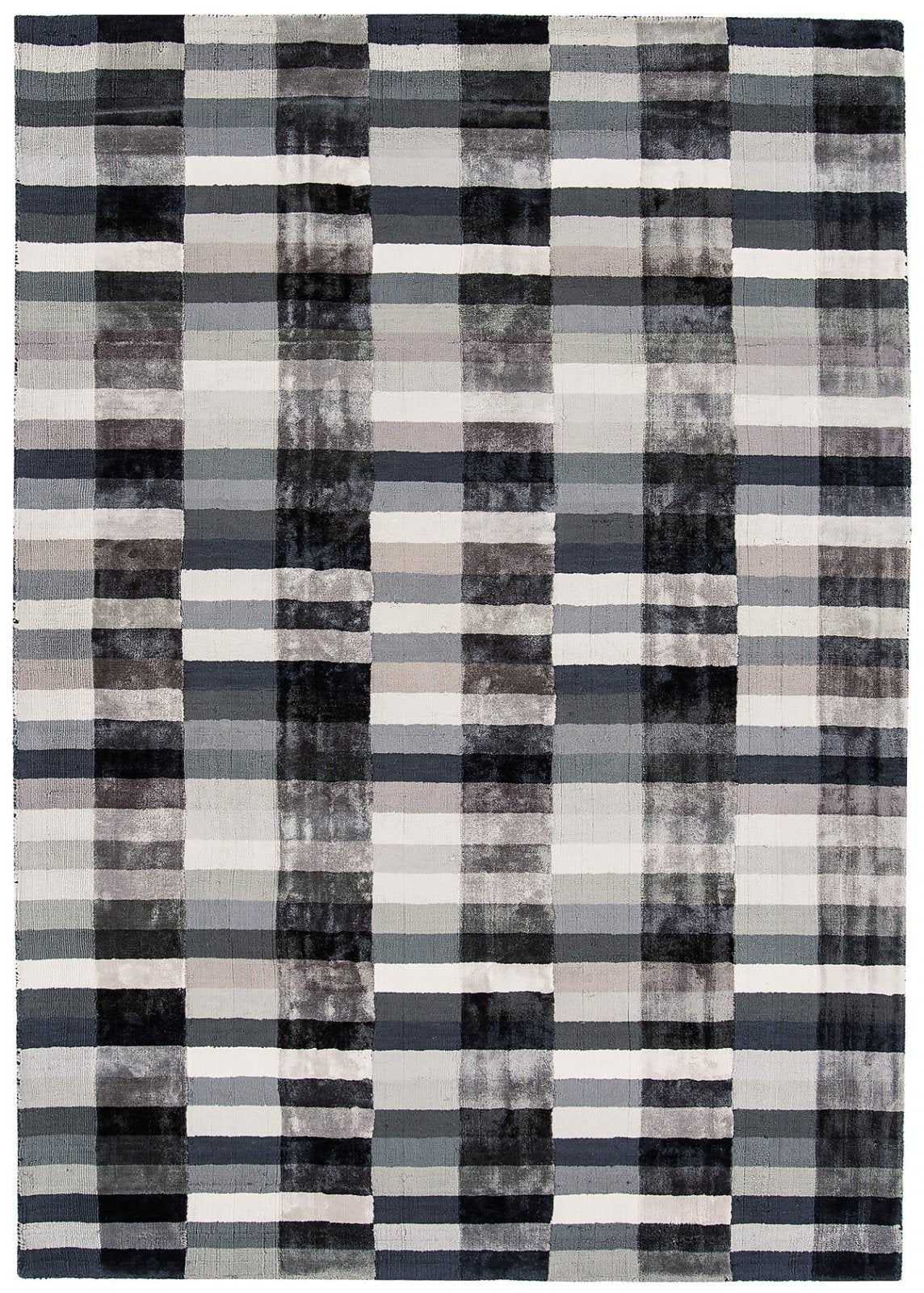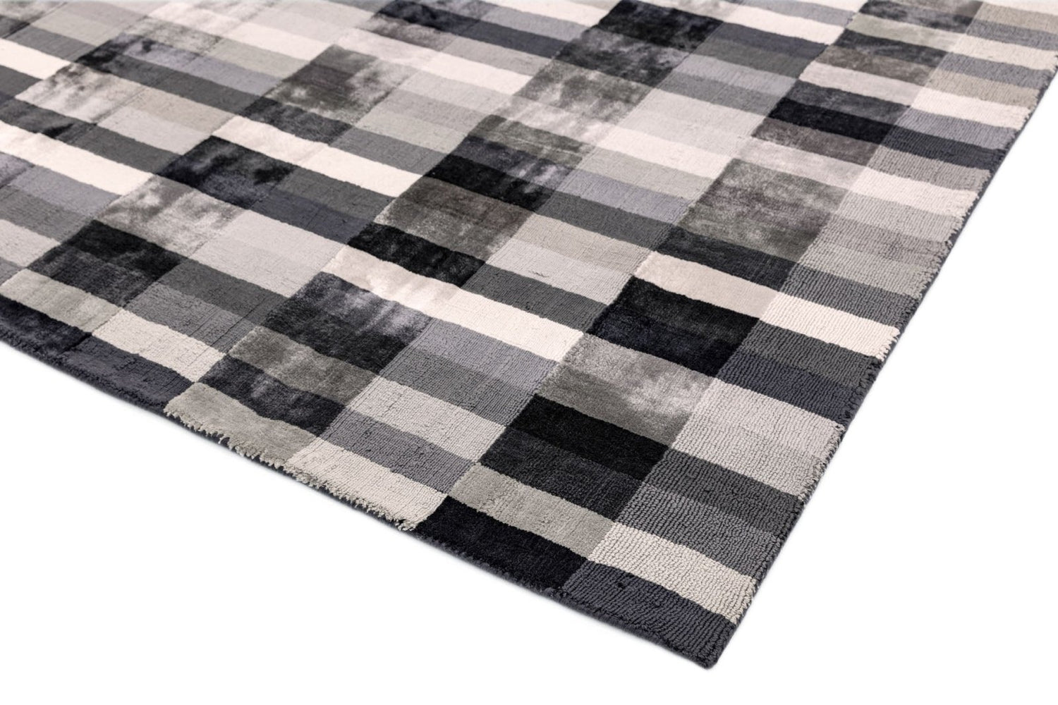 Kaleidoscopic geometric rugs available in monchome, pastel or bold multi-coloured shades, hand-woven from 100% viscose for a shiny finish.