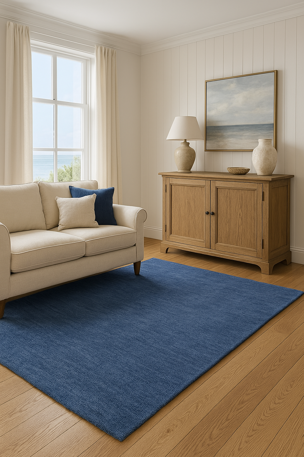 Elgin Midnight Chambray Blue brings a calm, grounded richness to the room. The soft blue tone sits between chambray and ink – deep enough to feel anchored, but softened by gentle tonal variation across the wool surface.