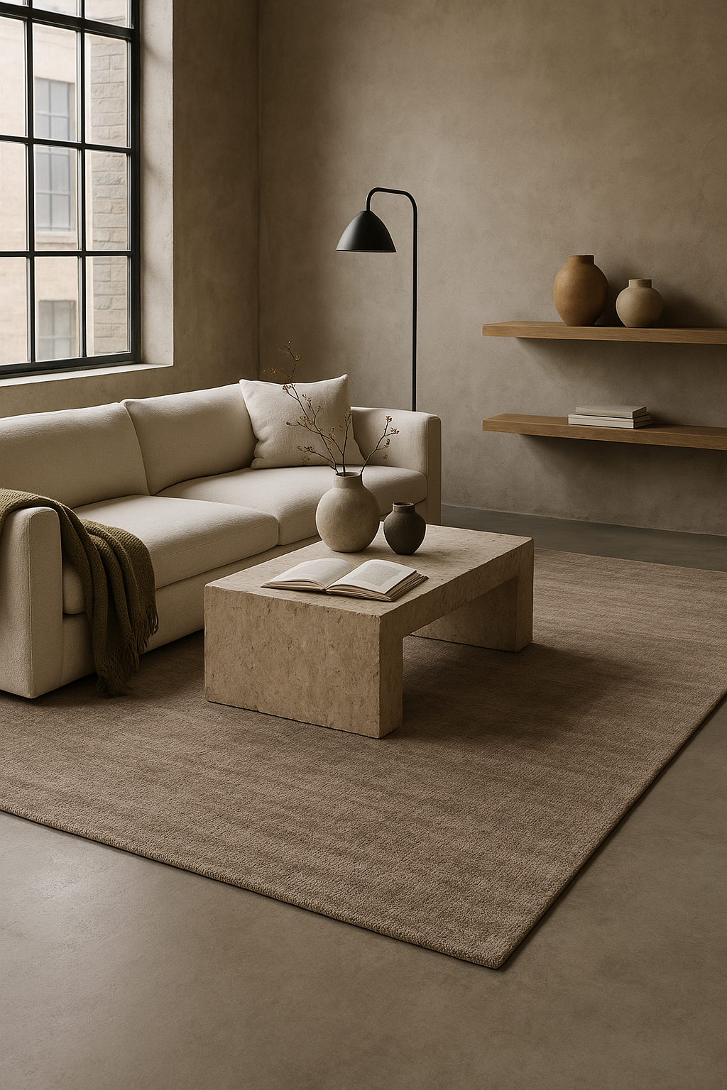 This is a rug that settles beautifully into calm, considered interiors – pairing effortlessly with wood, stone, and textured textiles. The smooth, dense pile adds comfort and weight, making it a practical yet elevated choice for living rooms, bedrooms, or open-plan spaces.