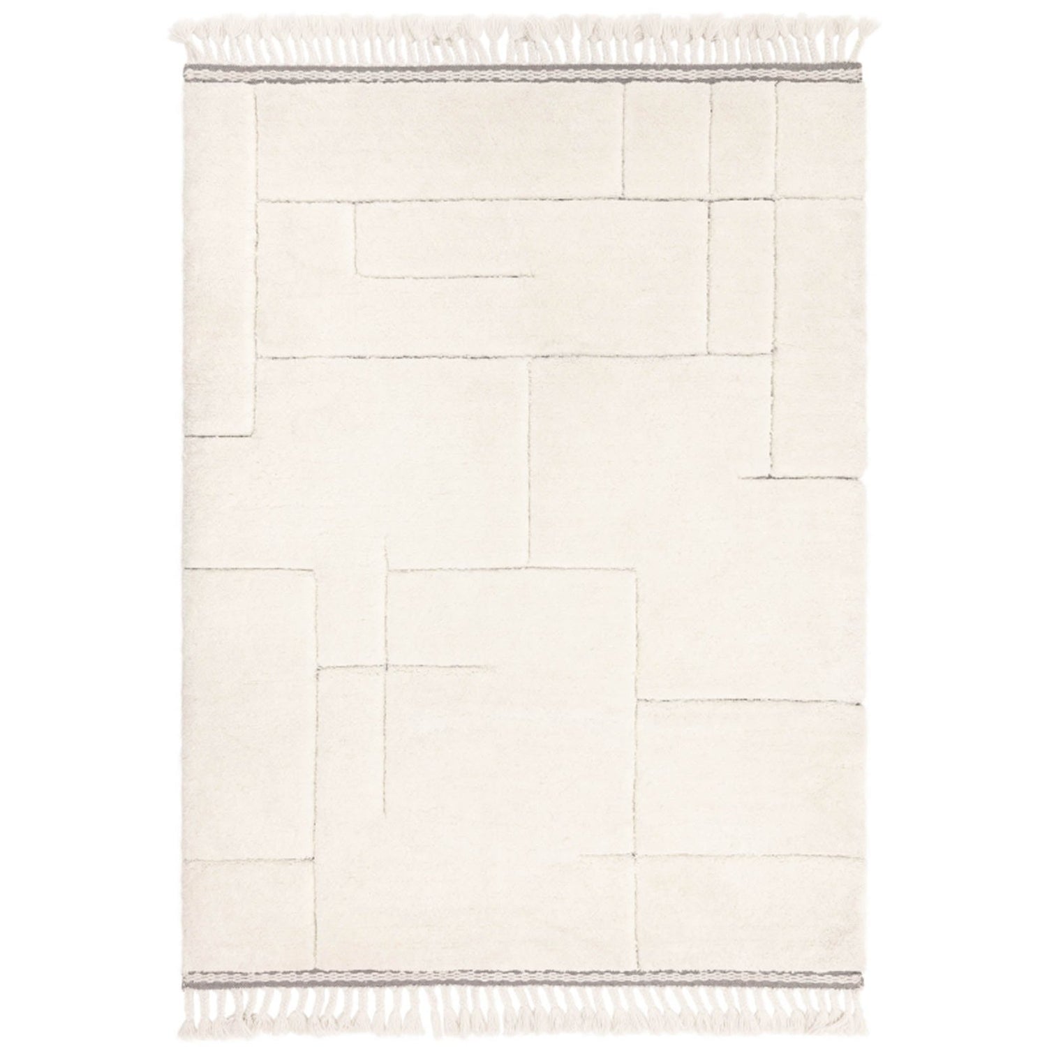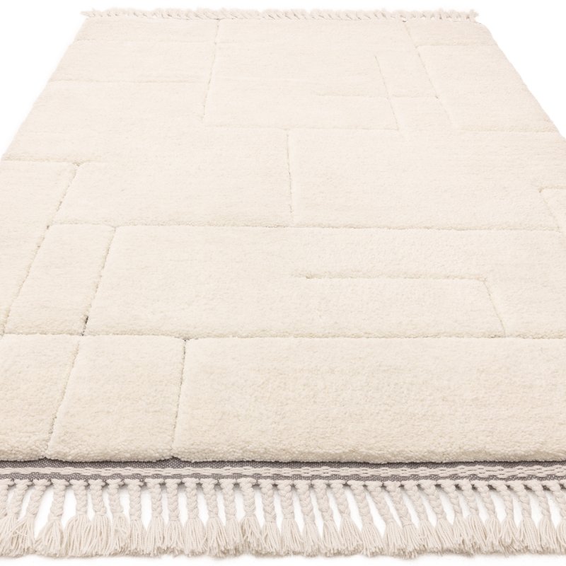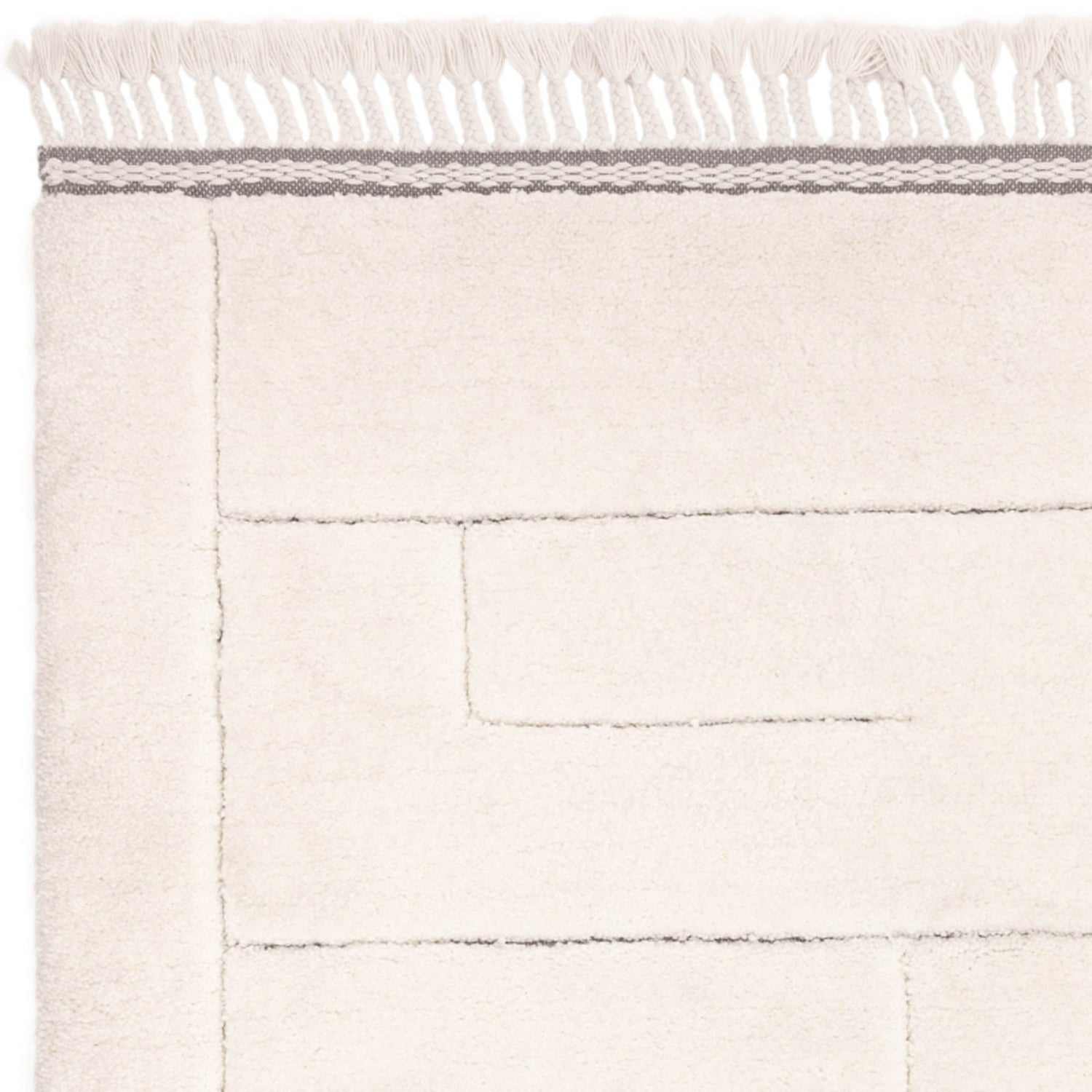 Designed using a kelim base and tufted to create a sumptuous high pile, it offers both texture and depth. The subtly carved geometric pattern, formed by intersecting lines, adds a modern touch, while the neutral cream tones with delicate grey accents ensure versatility. Finished with decorative fringed edges, this rug exudes effortless sophistication.