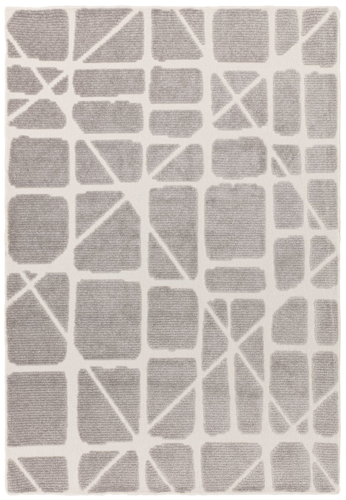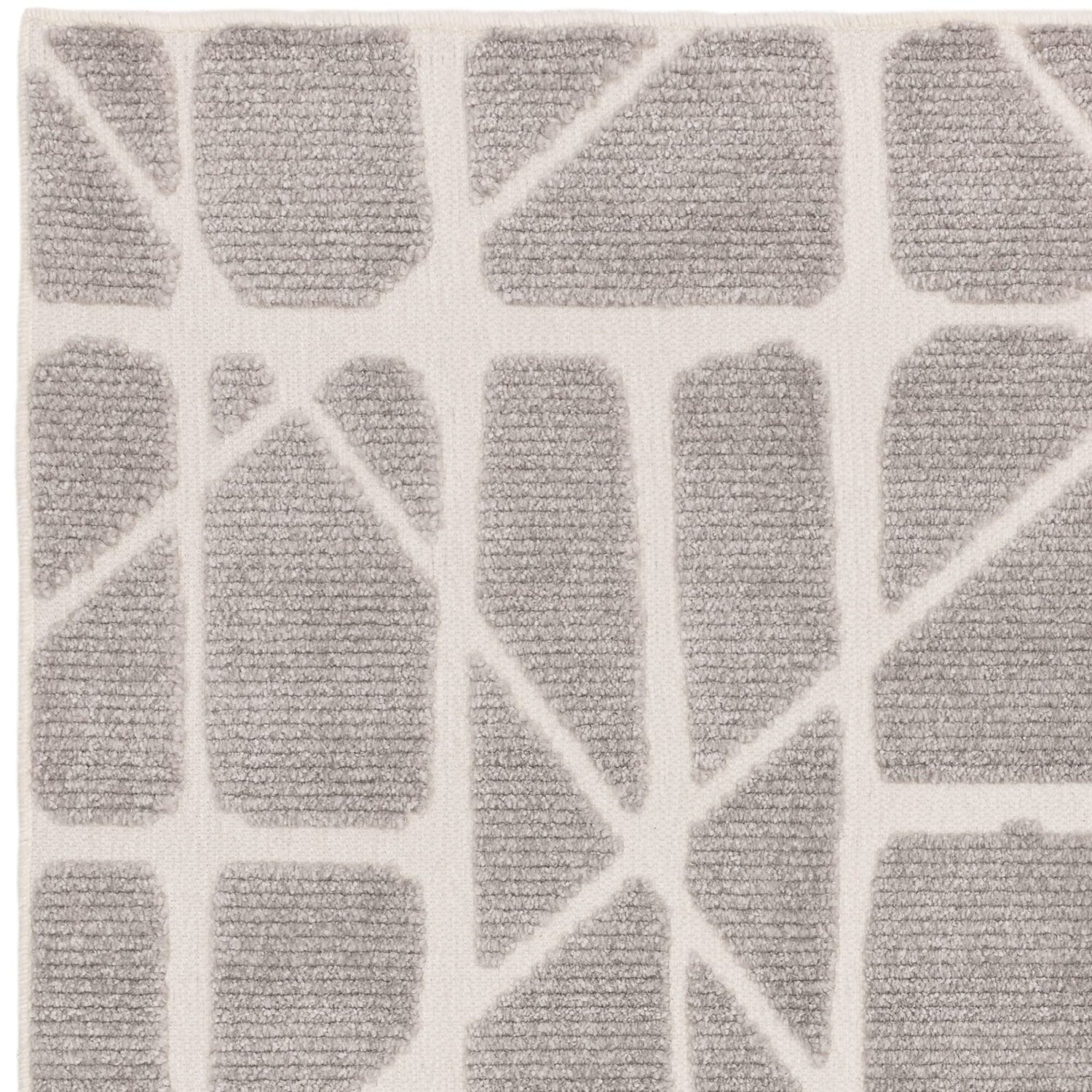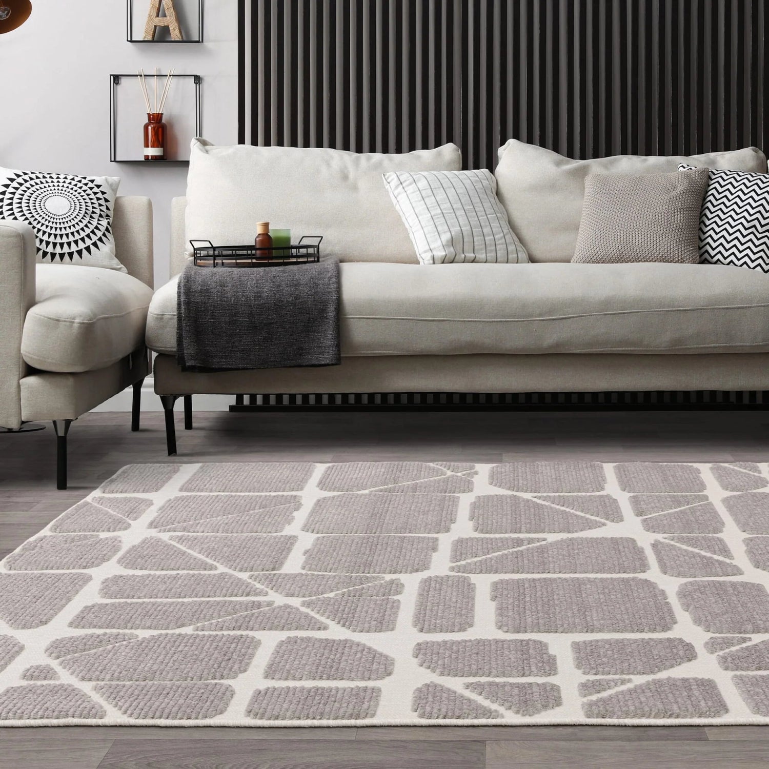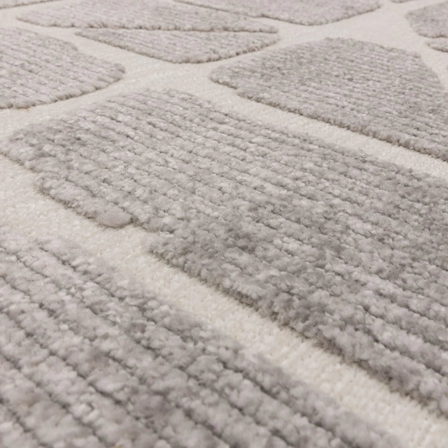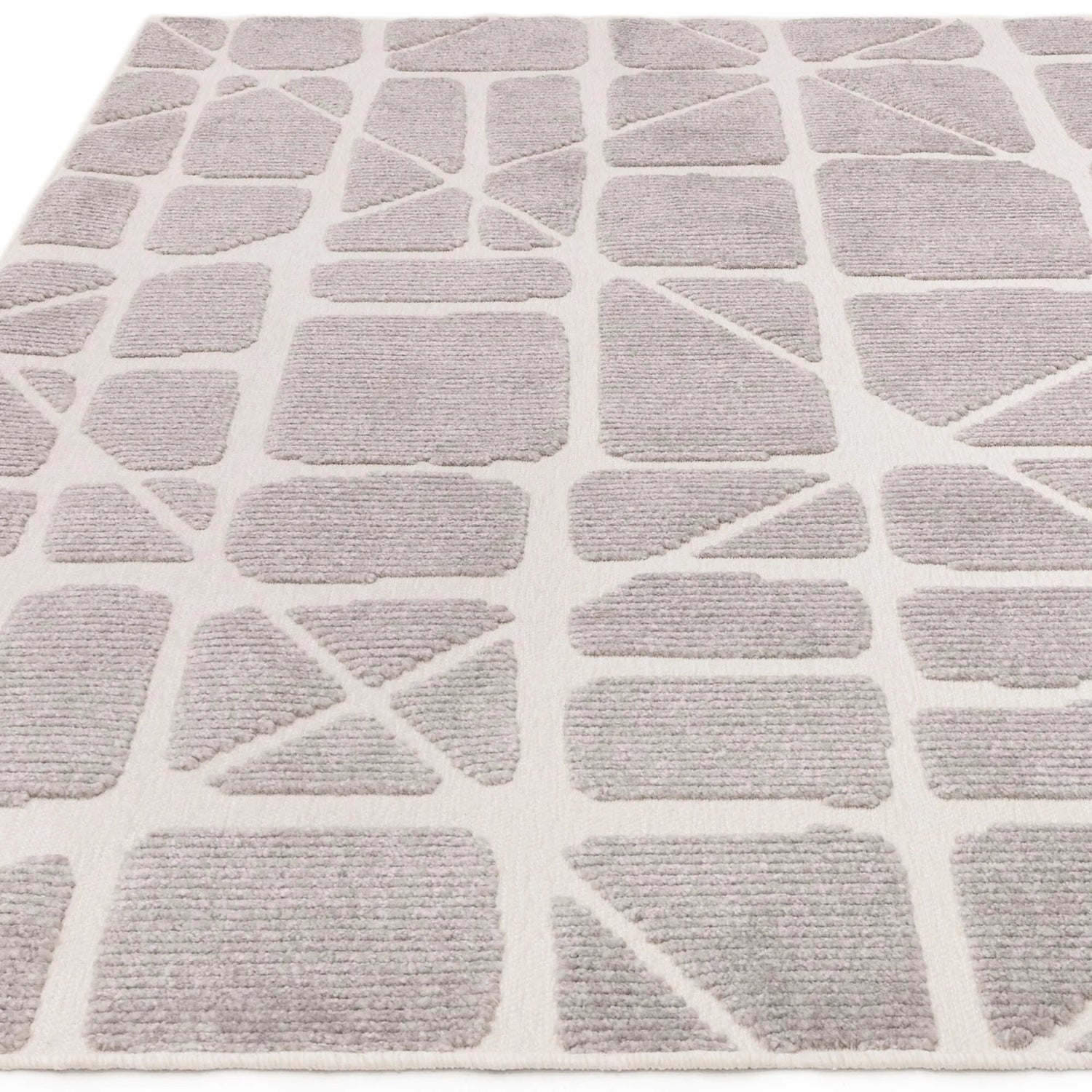 The Freja Method Grey Rug combines modern design with everyday practicality, offering a striking geometric pattern in soft grey tones against a creamy white background. Machine woven, the textured shapes create a captivating 3D effect that adds depth and dimension to your space, while maintaining a clean, contemporary aesthetic.