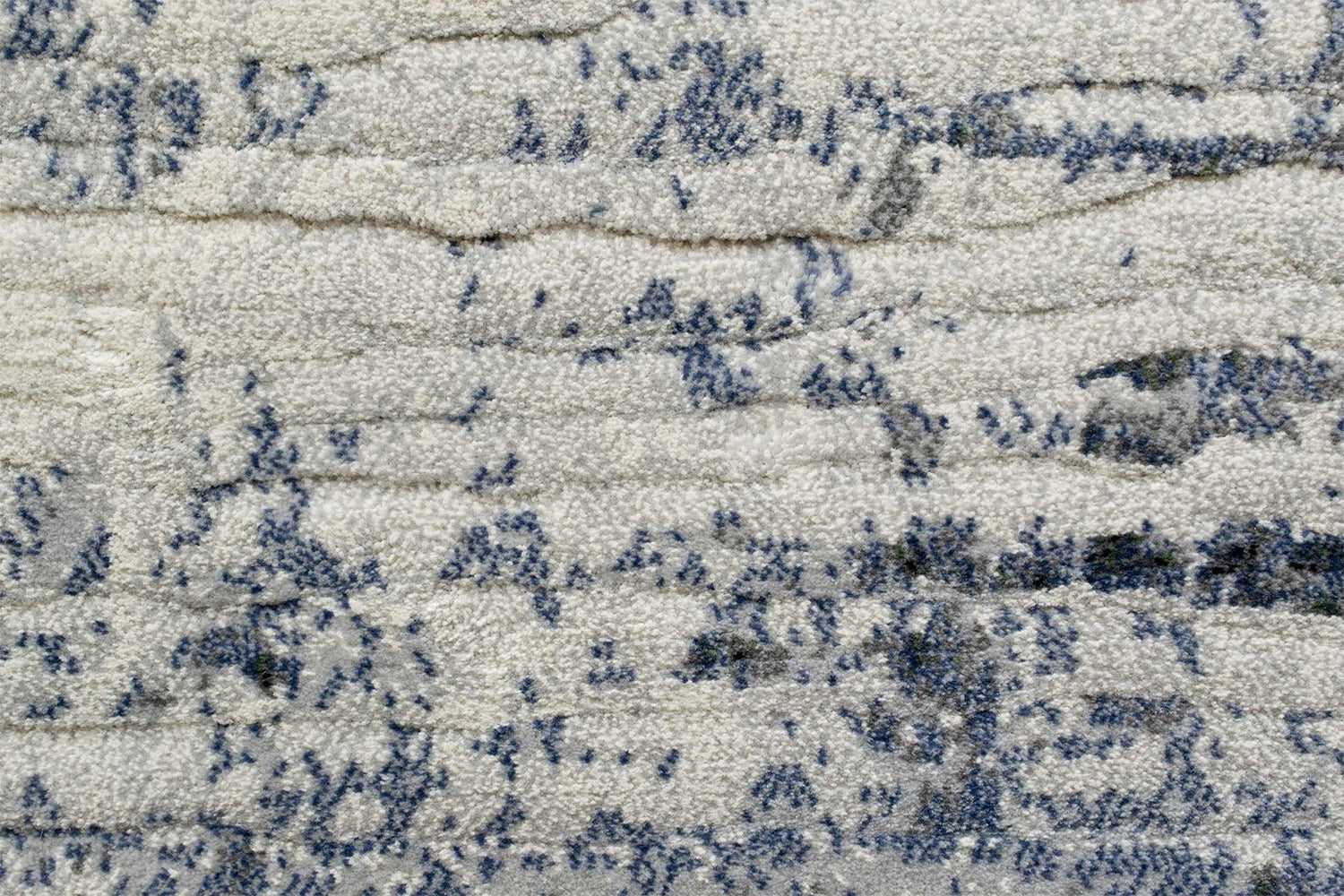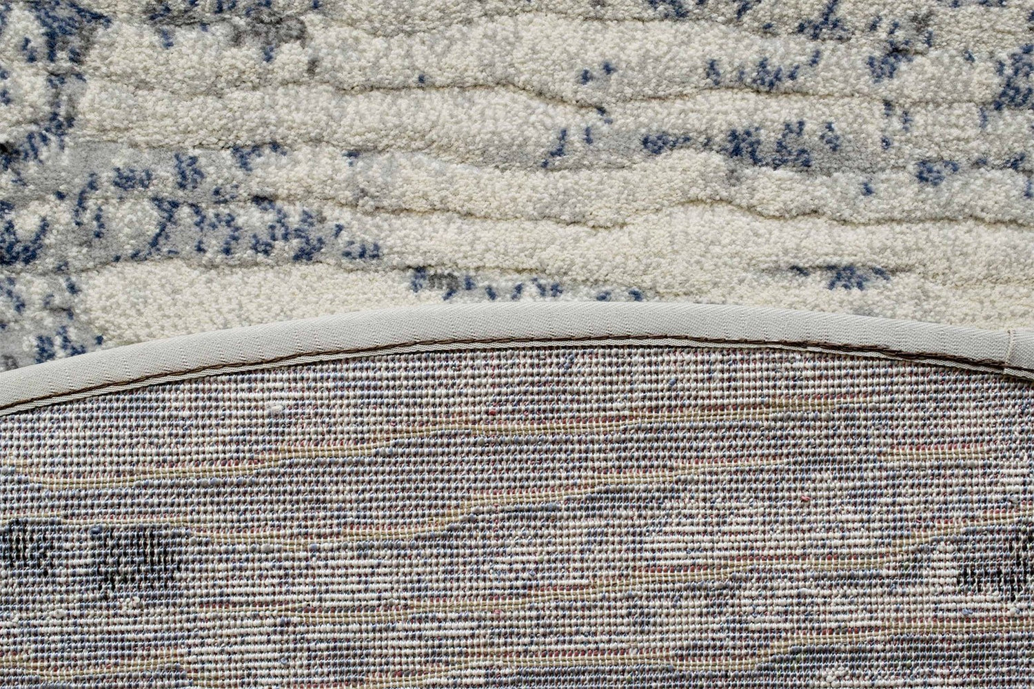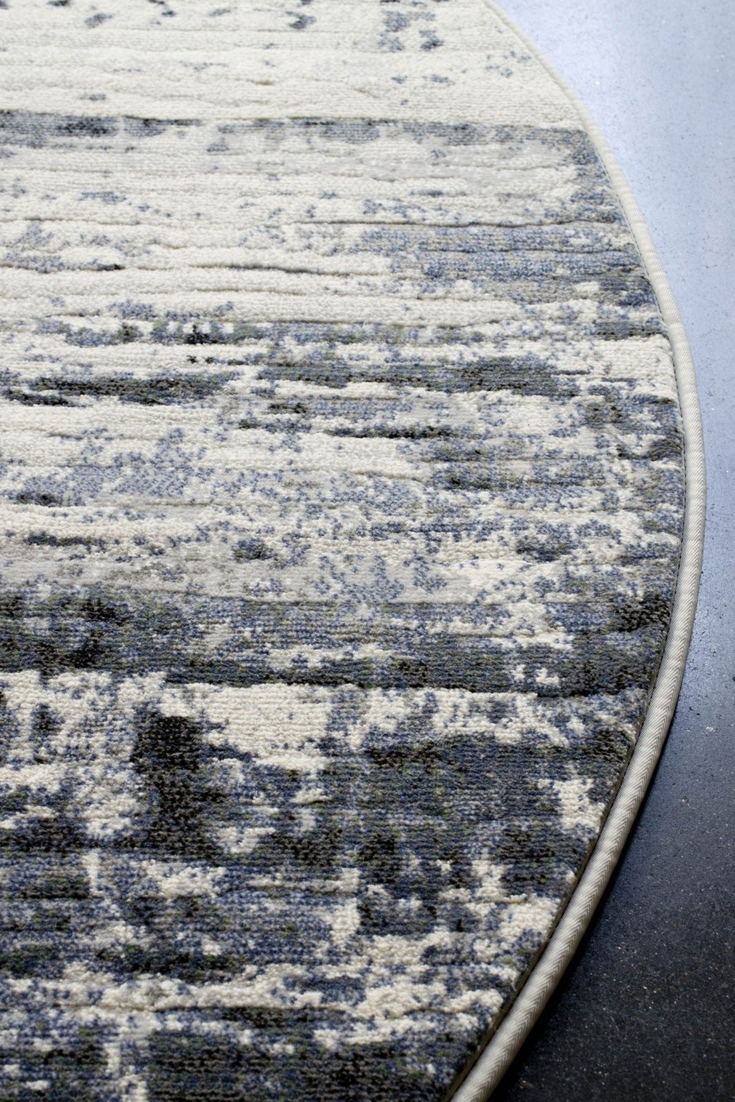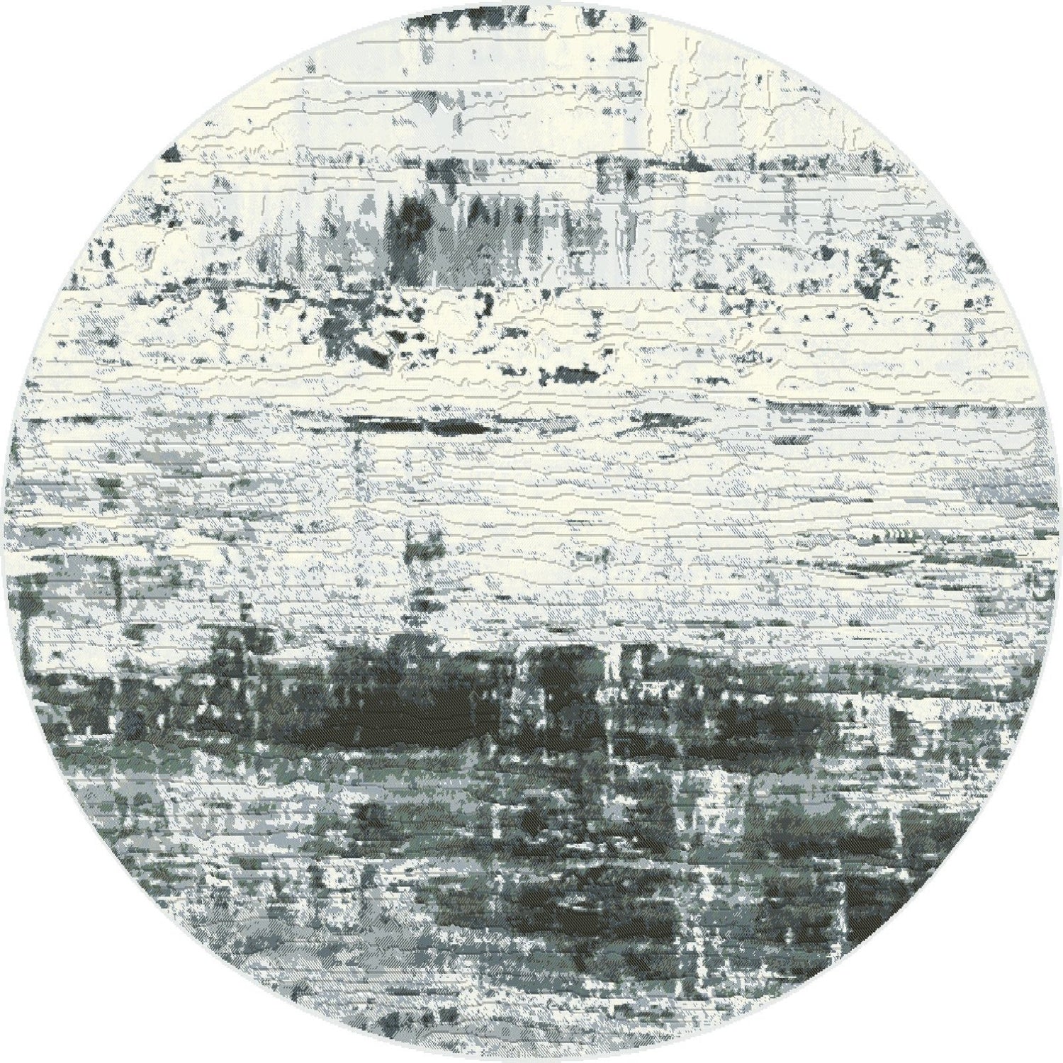 The Galleria 063-0378-6656 Round Rug features a striking abstract design that mimics weathered stone or brushed concrete. A soothing blend of cream, soft grey, charcoal, and muted blue tones flows across the surface, creating a modern and versatile look. The circular shape enhances its visual impact, perfect for softening angular spaces or highlighting a central feature like a coffee table or reading nook.