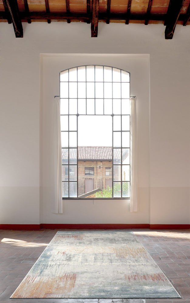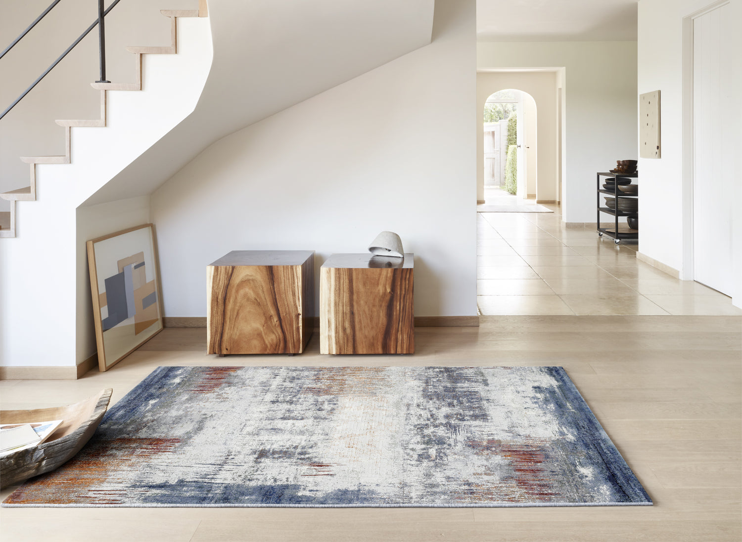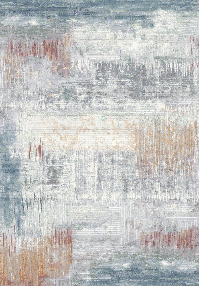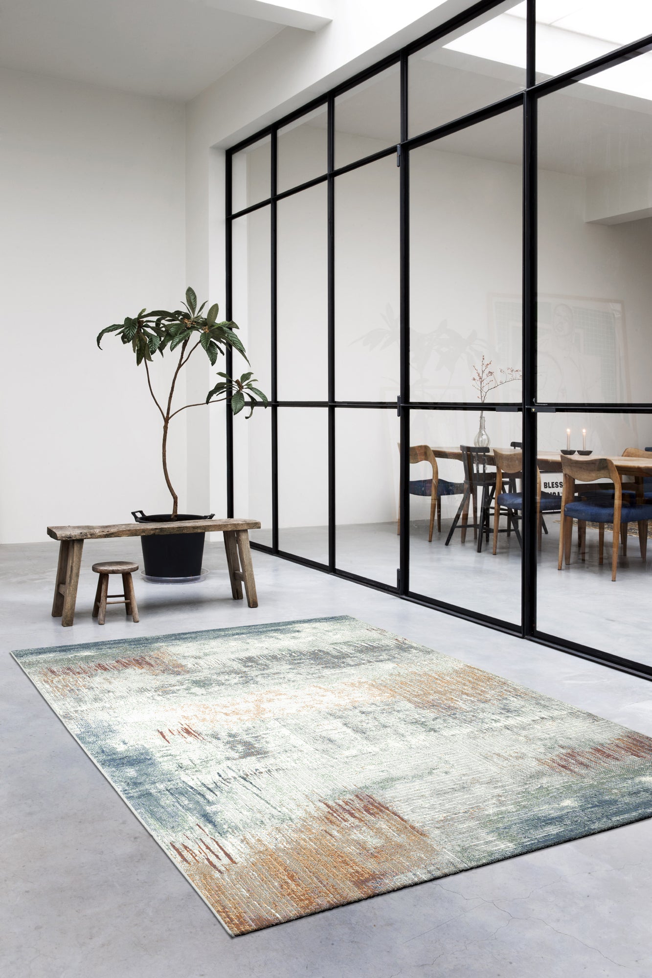 The Galleria 063-0393/6656 Rug features a beautifully abstract linear pattern, with soft layers of cool blue-grey, muted green, ivory, and warm terracotta tones. Its design has a weathered, painterly effect, giving the rug a sense of movement and depth that adds character to any room without overwhelming the space.