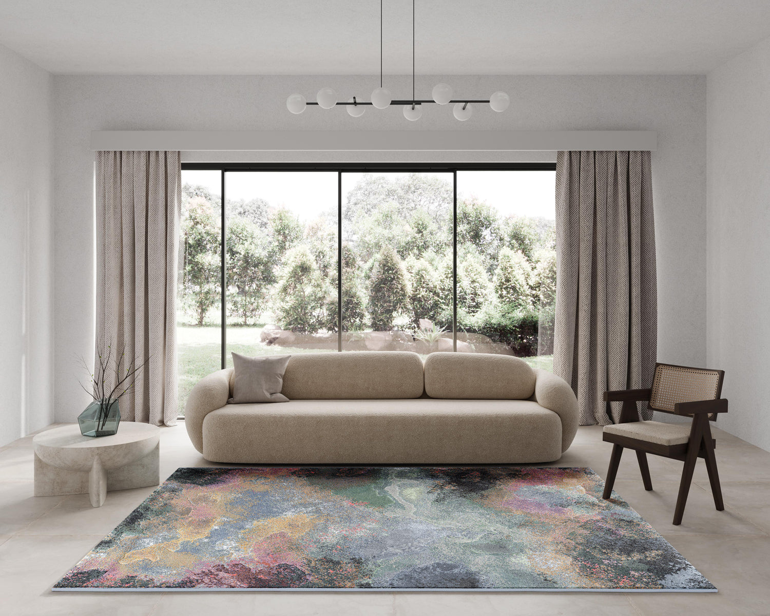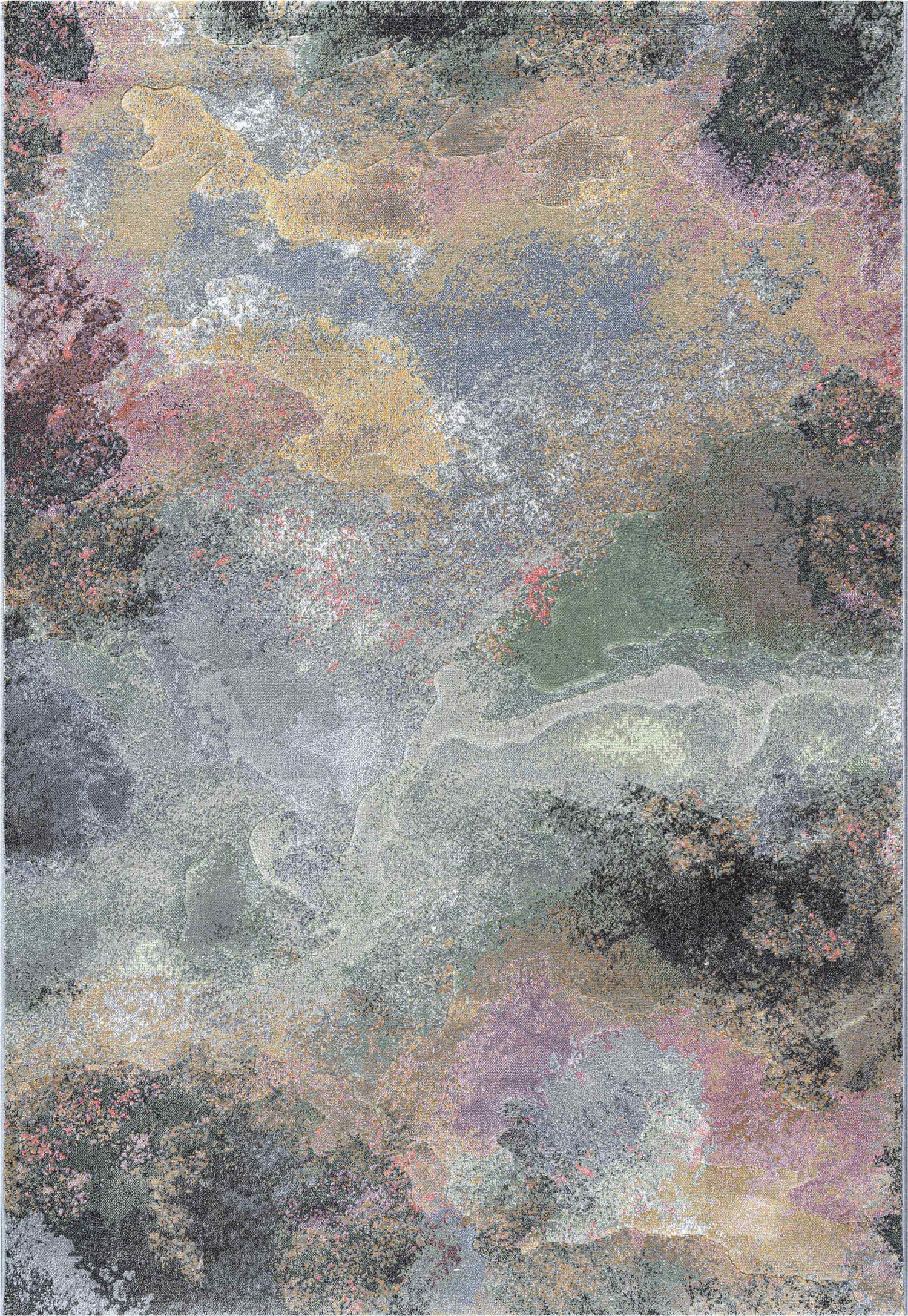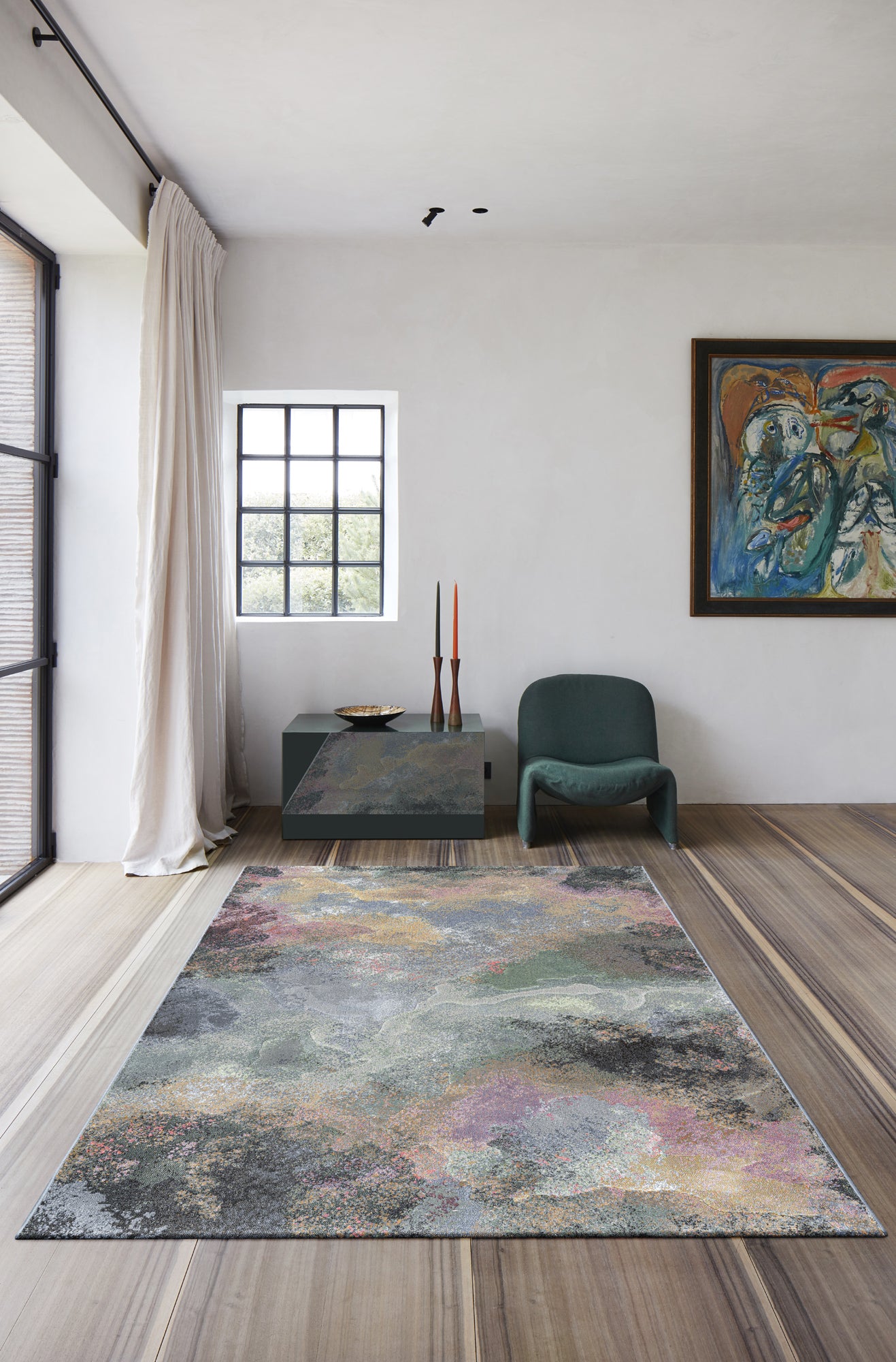 The Galleria 063-0934/5626 rug is a bold yet balanced statement piece, featuring a layered abstract design in soft greens, dusky lilacs, ochre, charcoal, and blush pink. The colours blend in a cloud-like formation, creating the impression of an expressive landscape or a watercolour canvas.