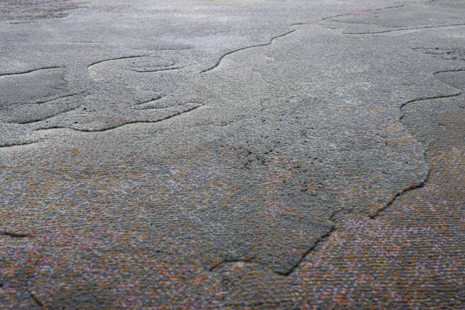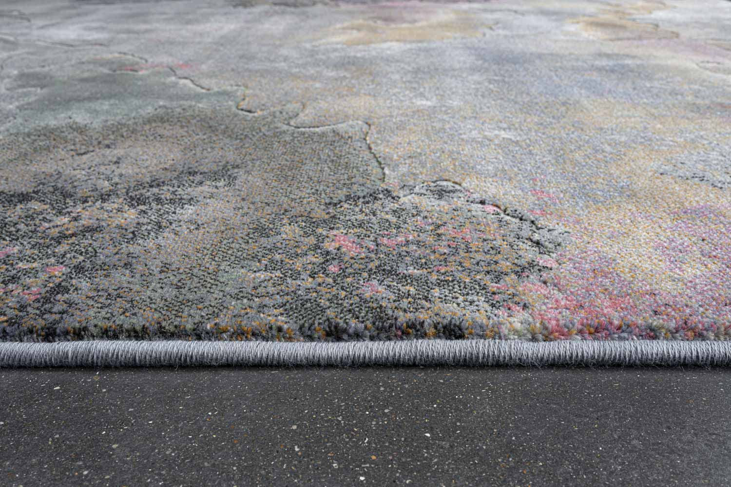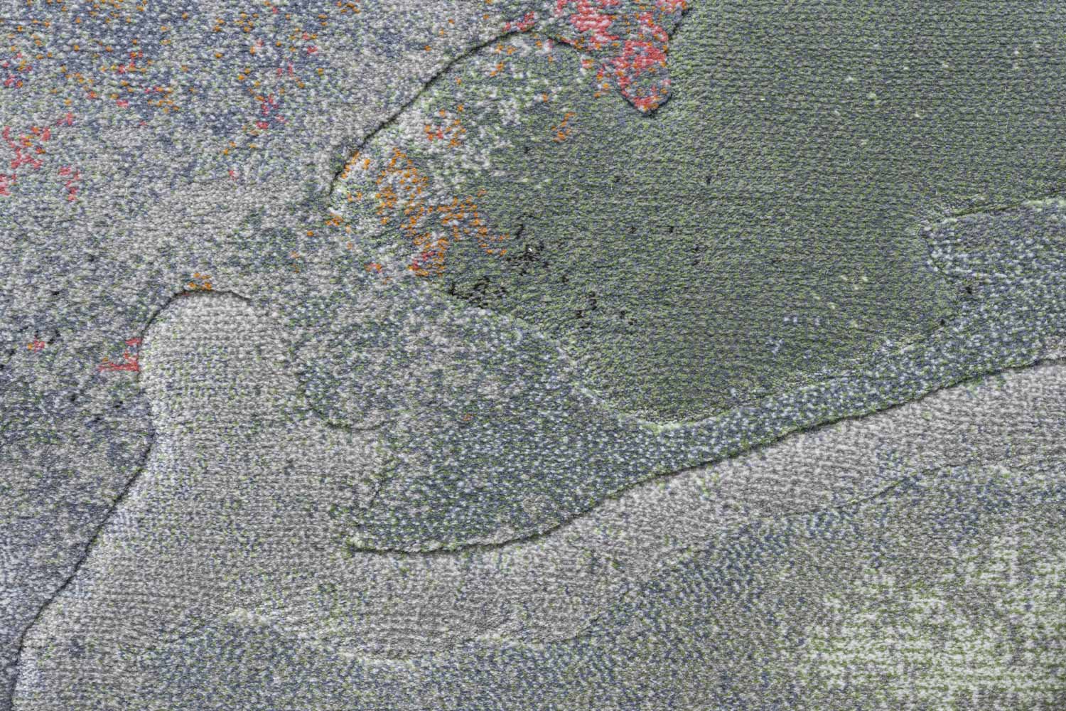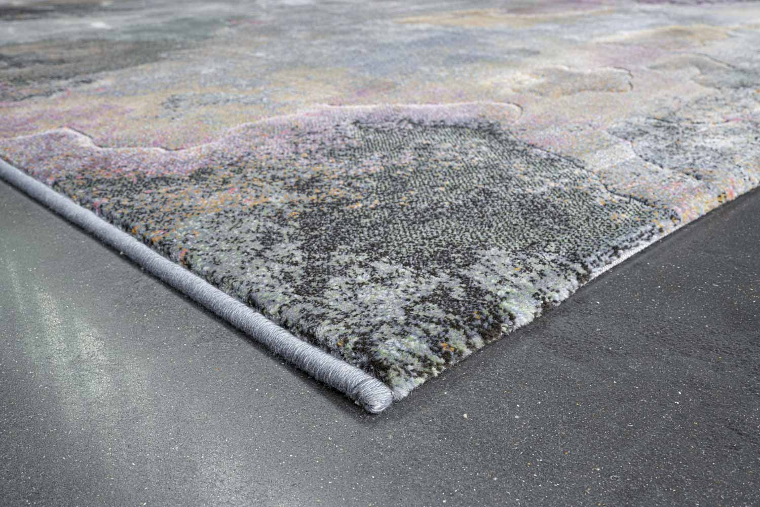 The Galleria 063-0934/5626 rug is a bold yet balanced statement piece, featuring a layered abstract design in soft greens, dusky lilacs, ochre, charcoal, and blush pink. The colours blend in a cloud-like formation, creating the impression of an expressive landscape or a watercolour canvas.