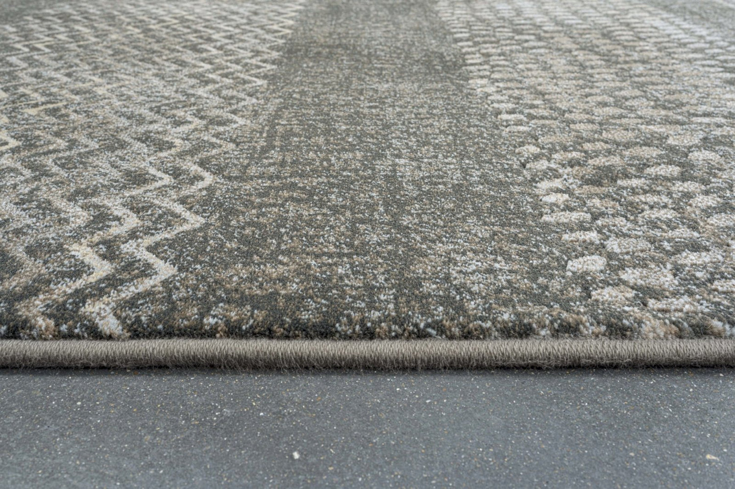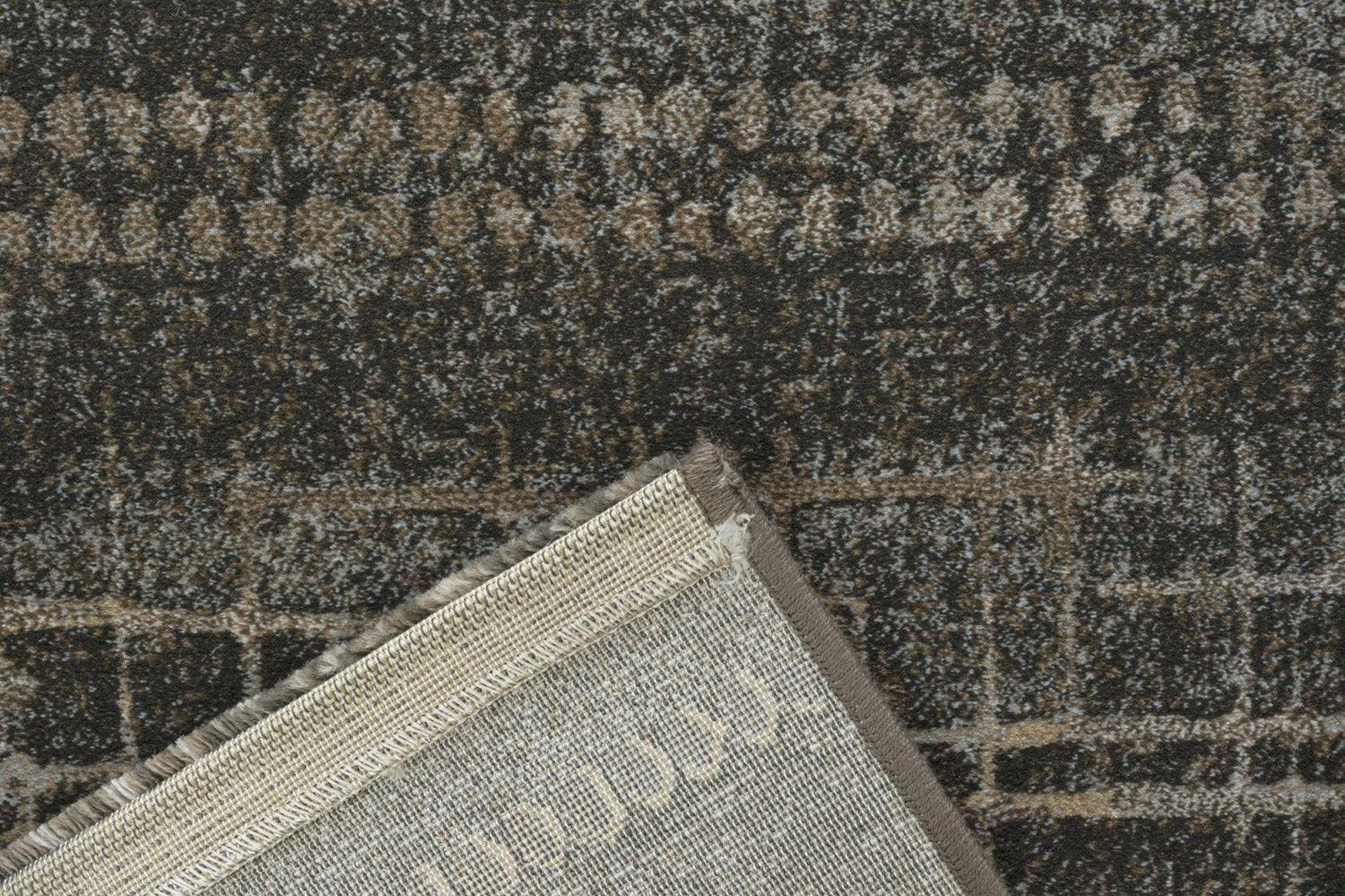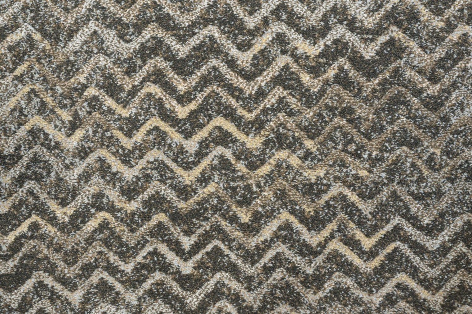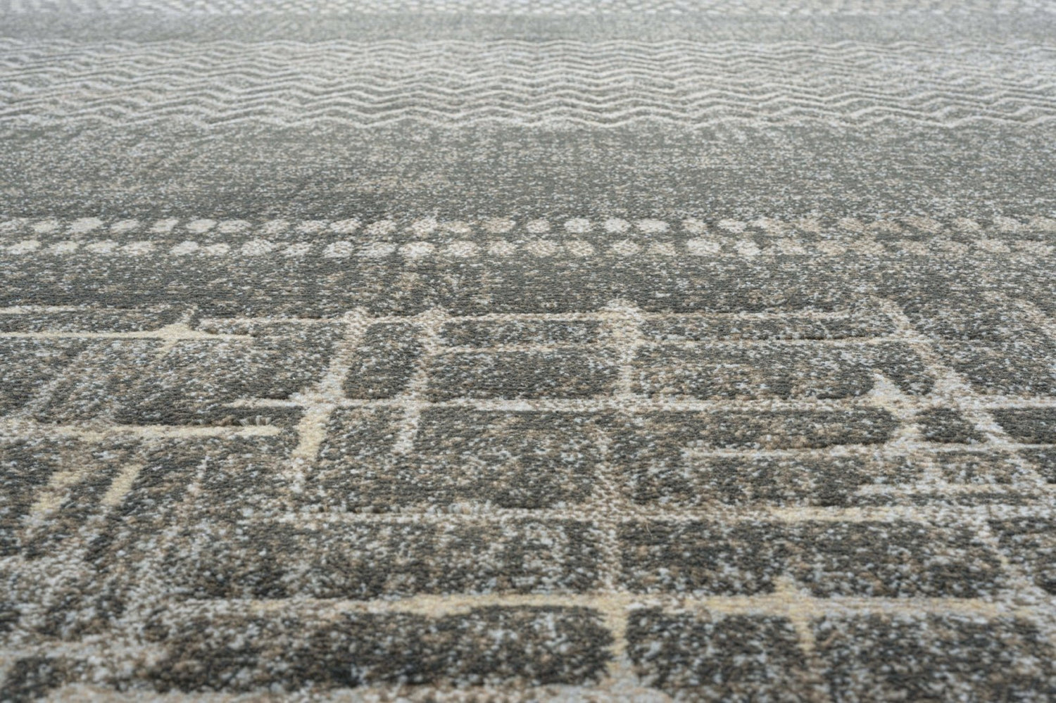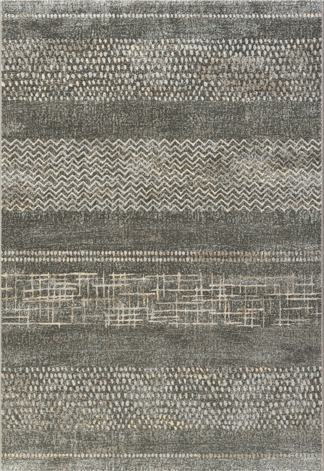 The Galleria 63857/3293 Rug combines bold texture and earthy tones in a striking, layered design. Bands of dotted, chevron, and linear patterns run across a deep charcoal and taupe backdrop, creating a rug that feels modern yet naturally grounded.