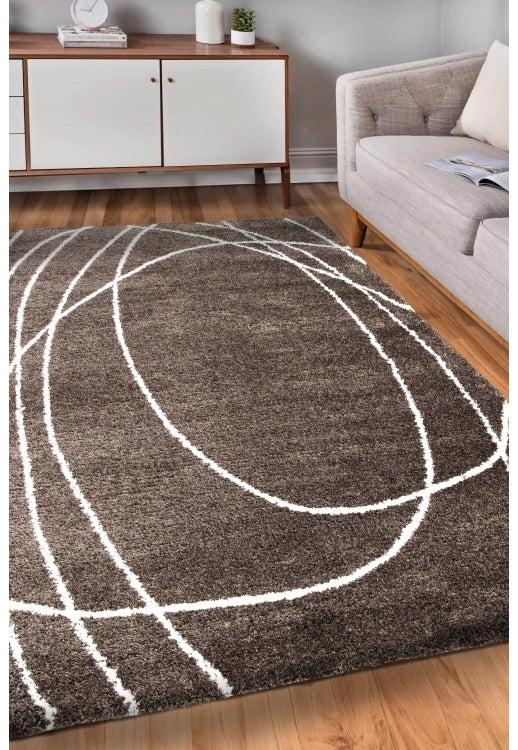 The Halo Squiggle Taupe Rug blends modern design with a soft, earthy palette. Its deep taupe background is accented by flowing off-white lines, creating an abstract yet balanced look that adds movement and interest to any space.