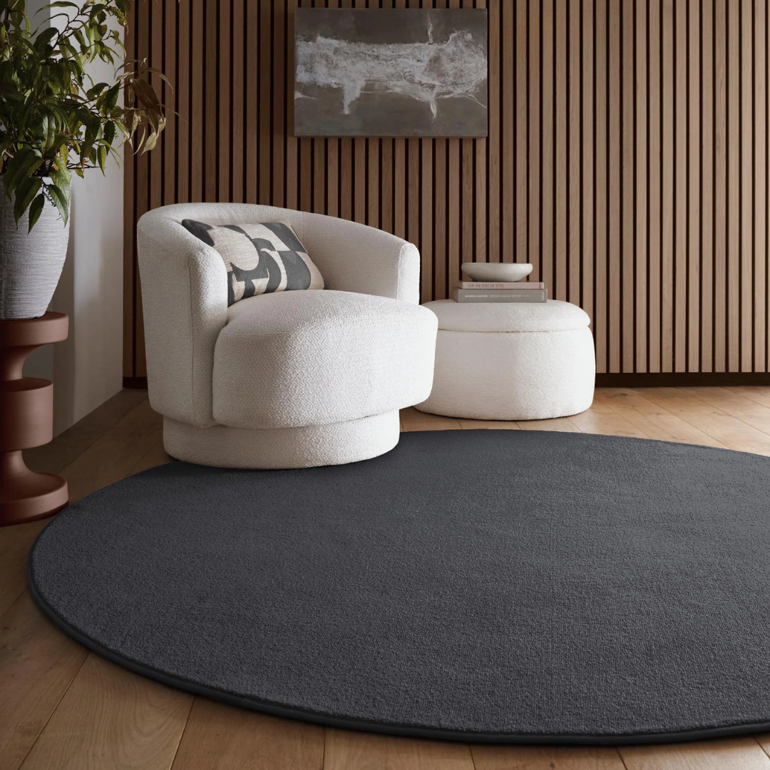 Machine-washable and sustainable, this circular rug offers both style and practicality. Its dark, versatile hue pairs effortlessly with natural textures, soft neutrals, or metallic accents, creating a refined foundation for contemporary living.