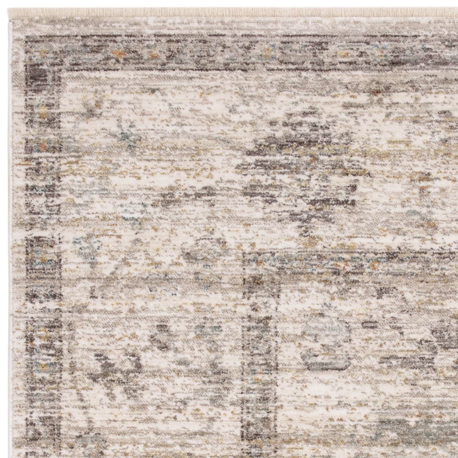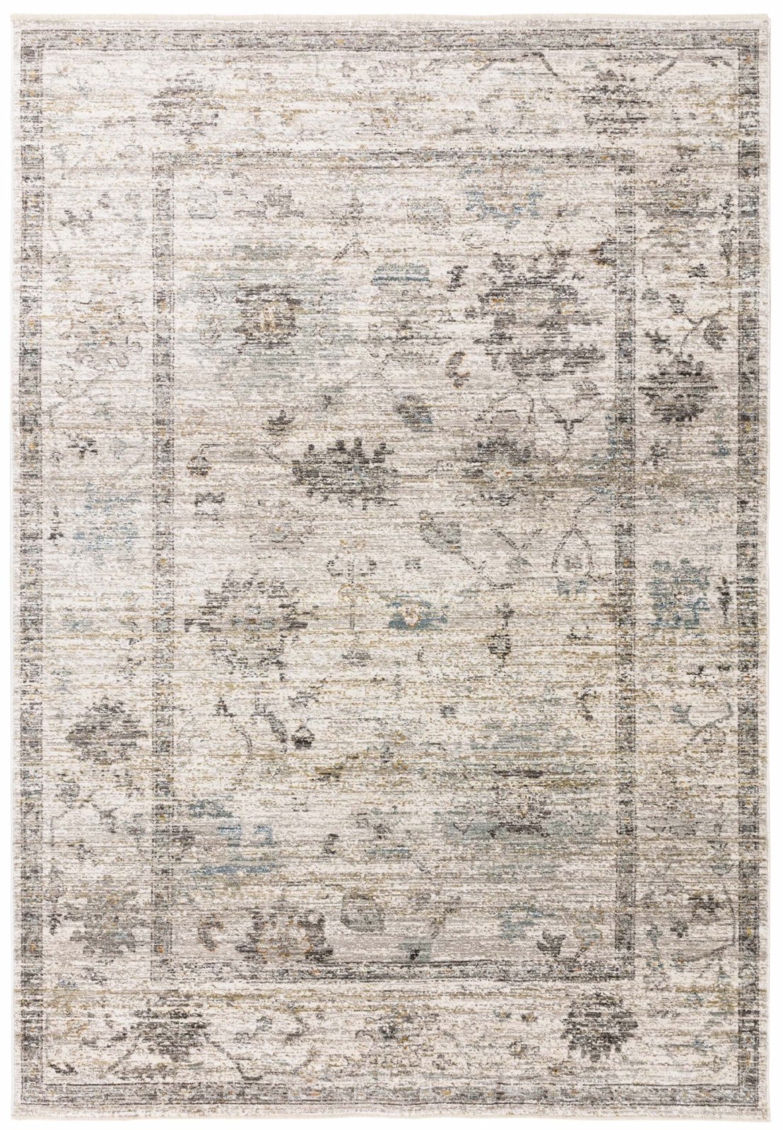 Featuring a delicate floral motif and a classic bordered design, this rug showcases muted tones of grey, cream, and hints of pale blue and gold, creating an understated yet elegant aesthetic.