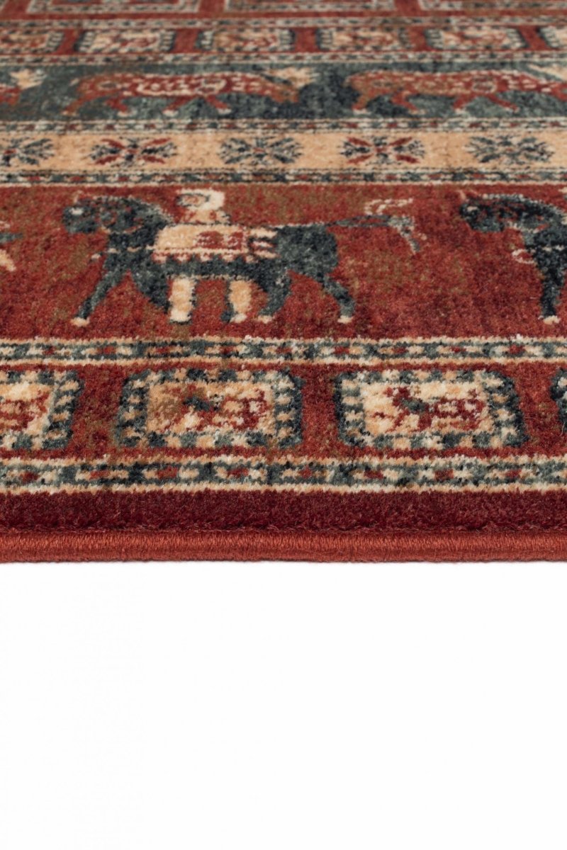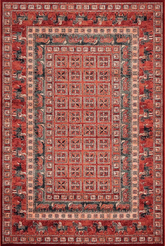 The Kashqai 4301/300 Rug features a beautifully intricate design inspired by traditional Persian motifs, with a rich palette of deep reds, teal, beige, and ivory. Its central geometric pattern is framed by detailed borders adorned with charming animal figures, bringing a sense of heritage and warmth to any space.