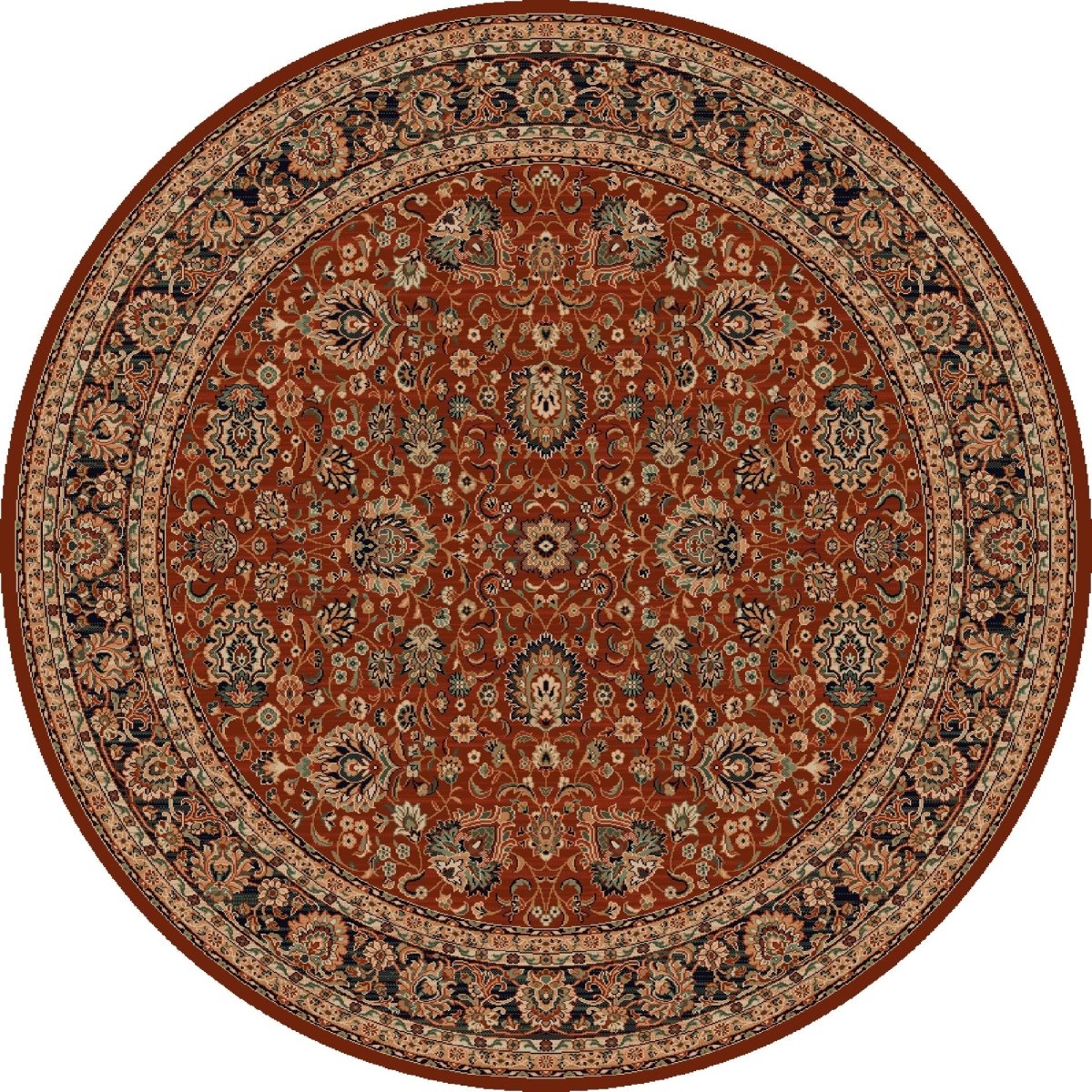The Kashqai 4362/300 Round Rug features a rich terracotta red base with intricate floral motifs in cream, sage, and black, all encircled by a beautifully detailed border. Its circular form adds a graceful dimension to more structured spaces, enhancing both symmetry and flow.