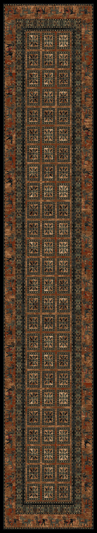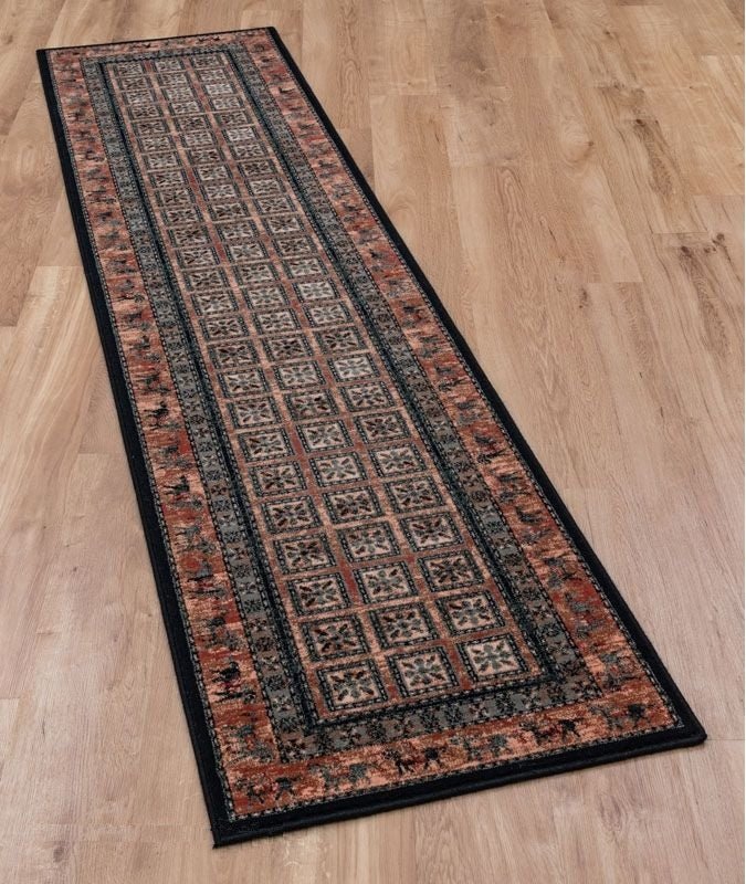 The Kashqai 4301/500 Runner Rug brings a bold and distinctive touch to hallways with its structured square-grid design and intricate border. Set against a rich mix of terracotta, charcoal, and olive tones, the central geometric motif is bordered with stylised animal and tribal figure details, perfect for those drawn to storytelling design.