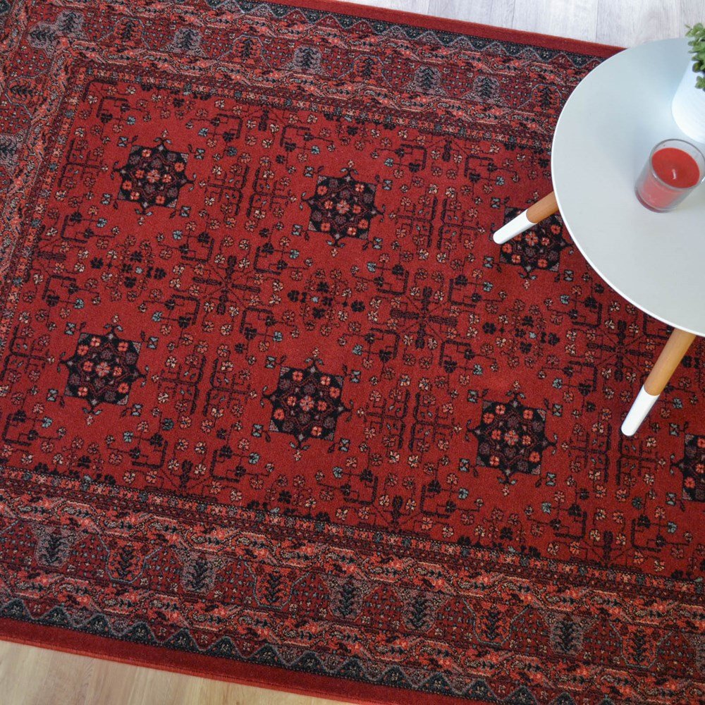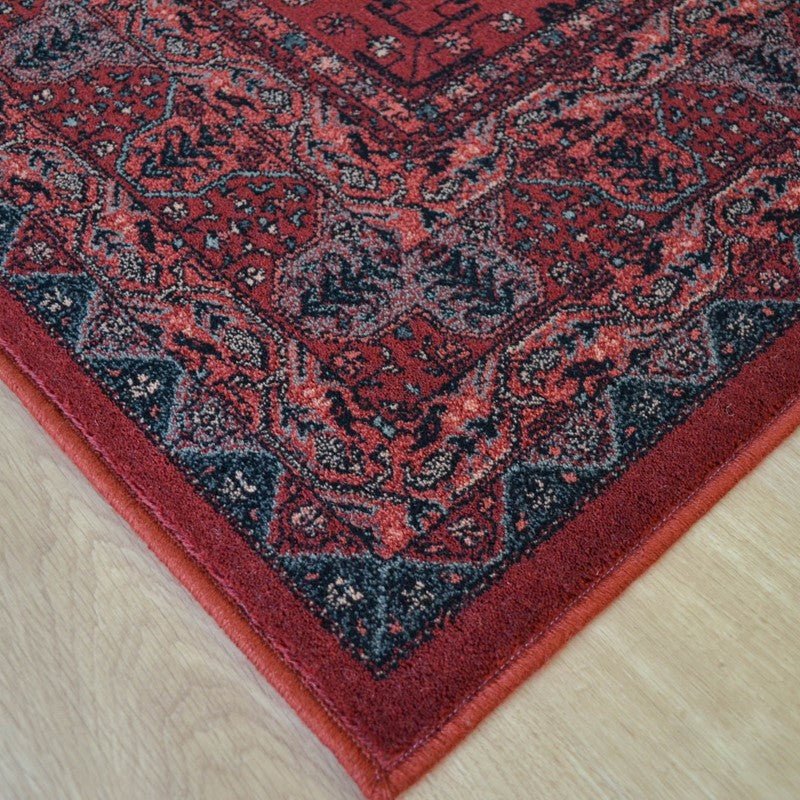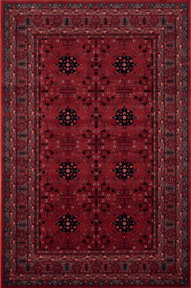 Classic and understated, the Kashqai 4302/300 Rug features a repeating geometric medallion design set against a rich, ruby red ground. Subtle accents in navy, cream, and soft green lend depth to the palette without overpowering the refined layout.