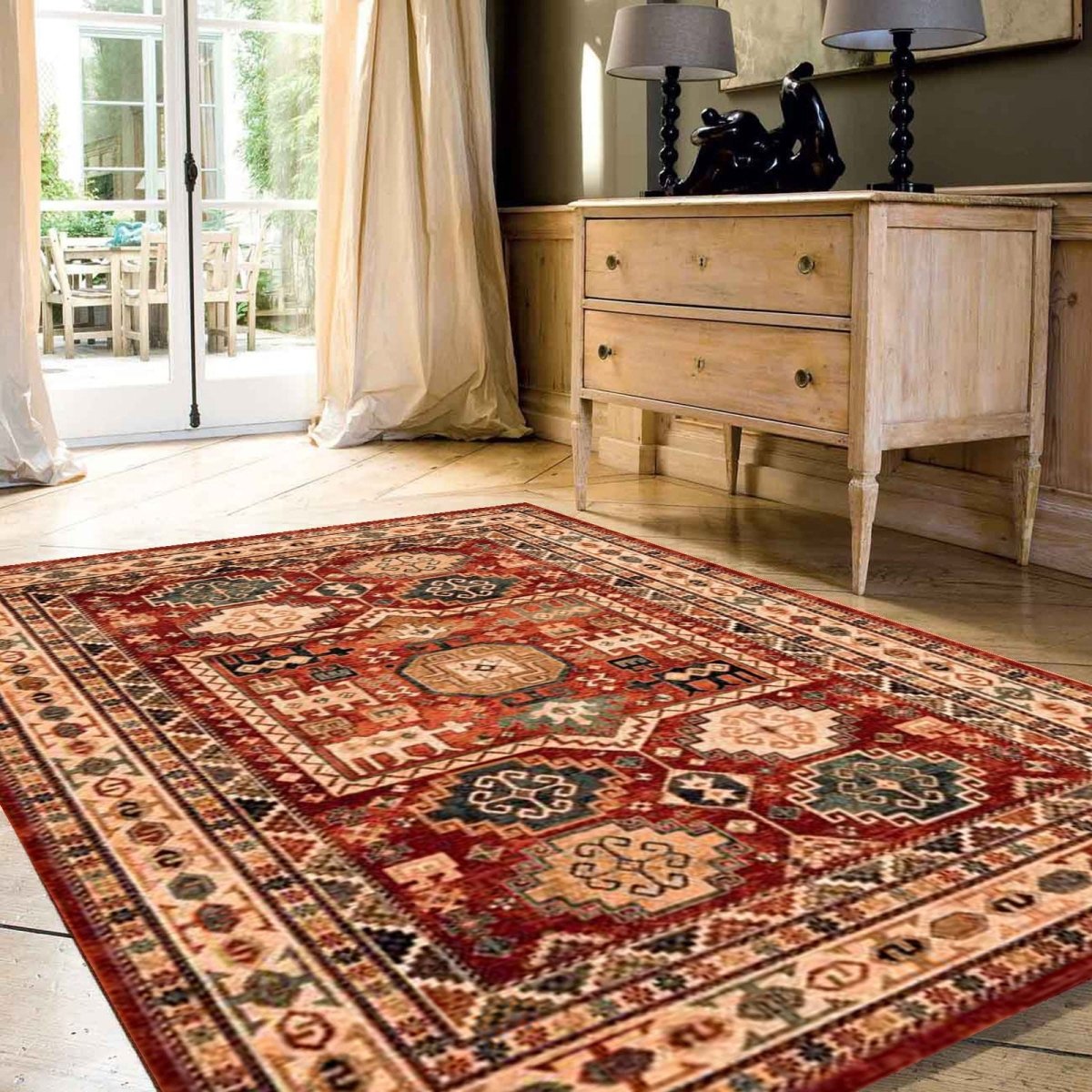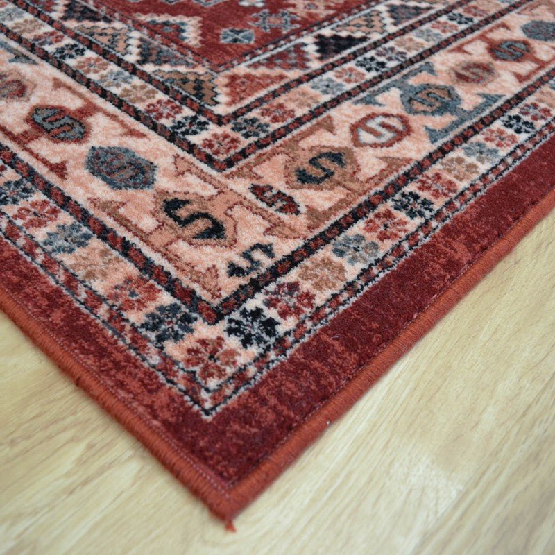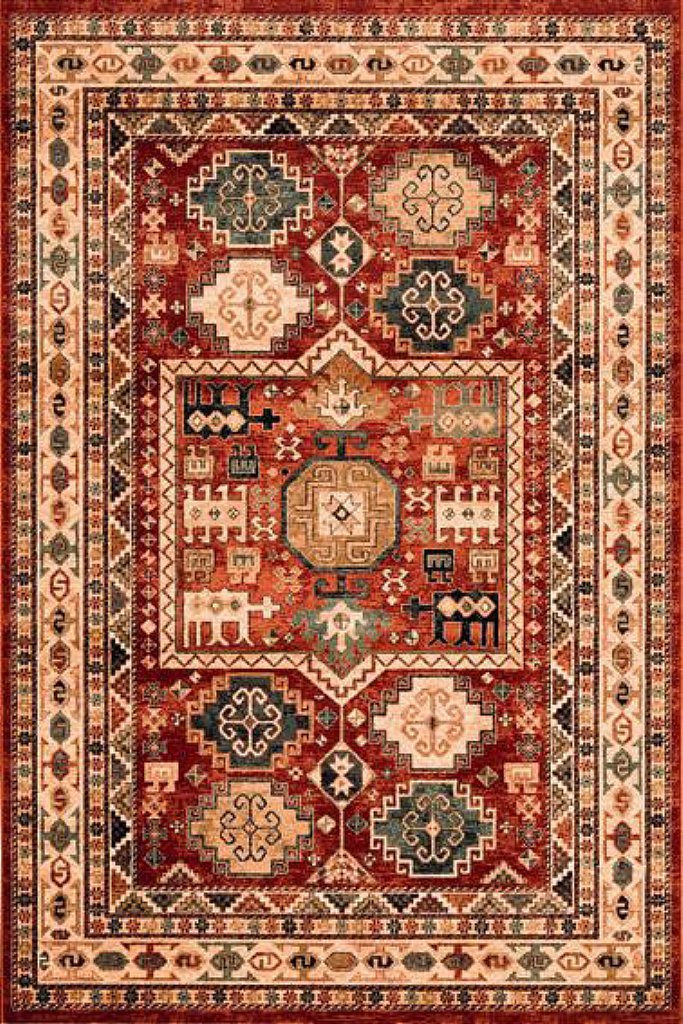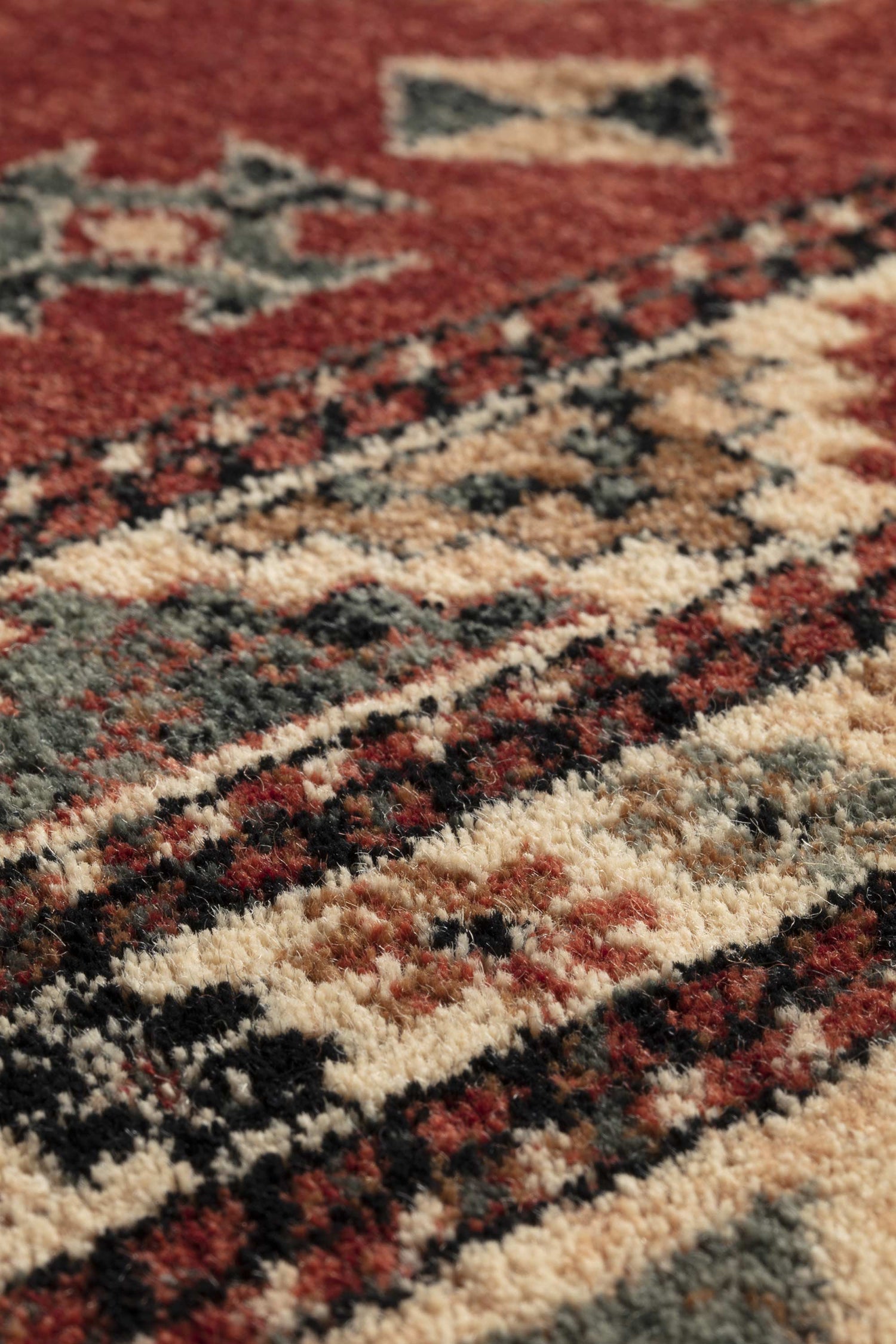A bold and beautifully detailed statement piece, the Kashqai 4306/300 rug brings together traditional tribal design with warm, welcoming tones. Rich red, soft ivory, muted teal and touches of olive green are arranged in a distinctive geometric layout, inspired by authentic nomadic weaving.