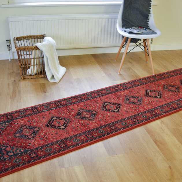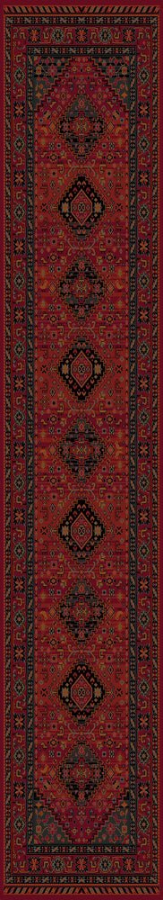 The Kashqai 4345/300 Runner Rug features a bold tribal design anchored by a central medallion repeat, set against a vibrant terracotta-red background. Accents of navy, saffron, and forest green add richness and depth, while stepped diamond motifs and stylised borders draw the eye along its length.