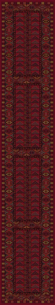 The Kashqai 4346/300 Runner Rug showcases a striking tribal-inspired design in a deep red base, accented with earthy browns, navy, and golden ochre. The linear, geometric pattern features bold diamond and arrow motifs, bordered with a traditional stepped design that adds structure and visual rhythm.