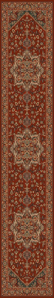 The Kashqai 4354/300 Runner Rug brings together deep terracotta tones with a repeating medallion design in ivory, sage and charcoal. Delicate floral and geometric motifs weave across the rust-red ground, creating a look that’s both rich and balanced.