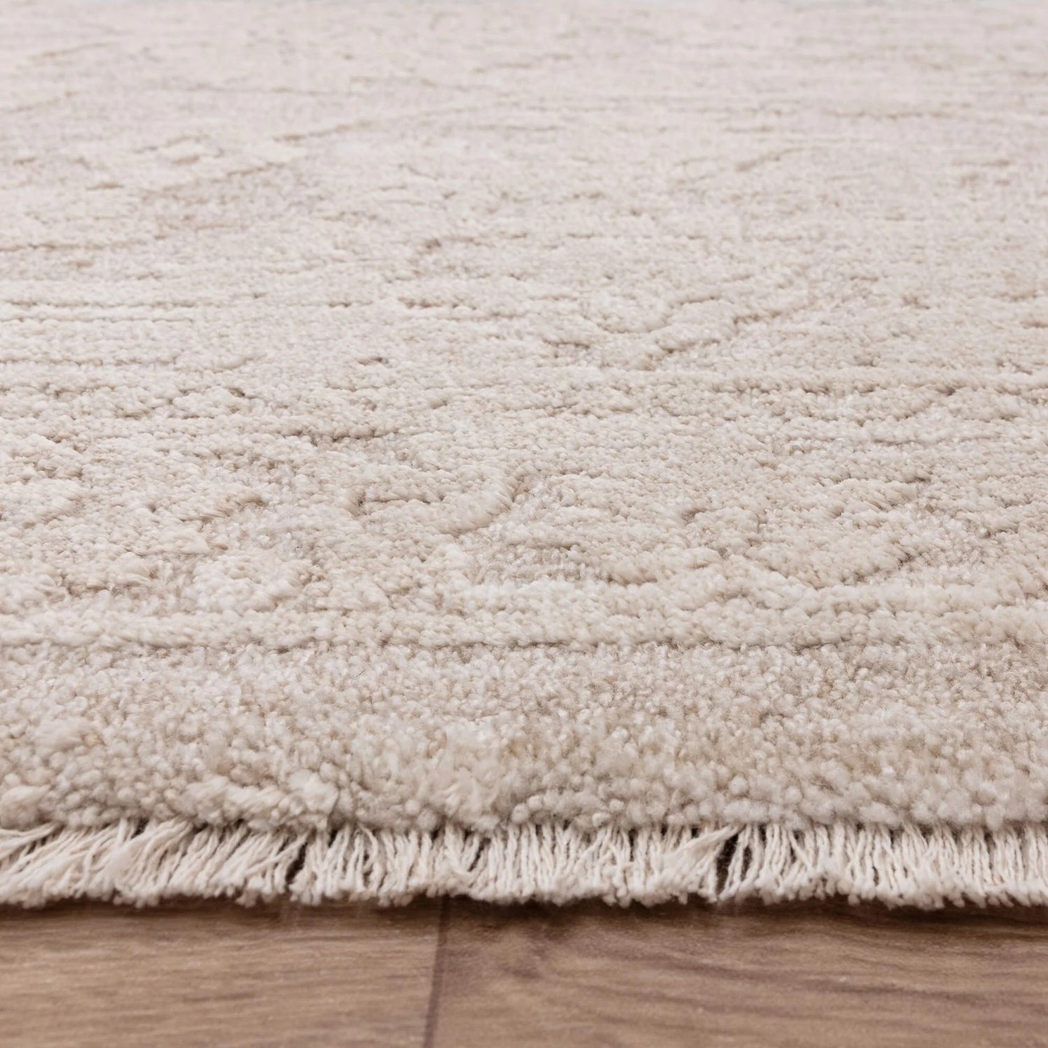 Machine-woven from 100% polyester, it offers a dense, lightly textured surface underfoot. The tonal ivory-beige colour palette softens the intricate detailing, making it easy to layer with modern furniture and natural textures.