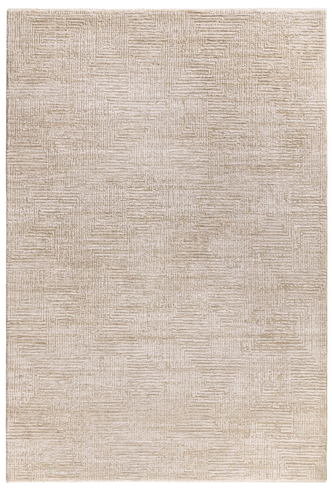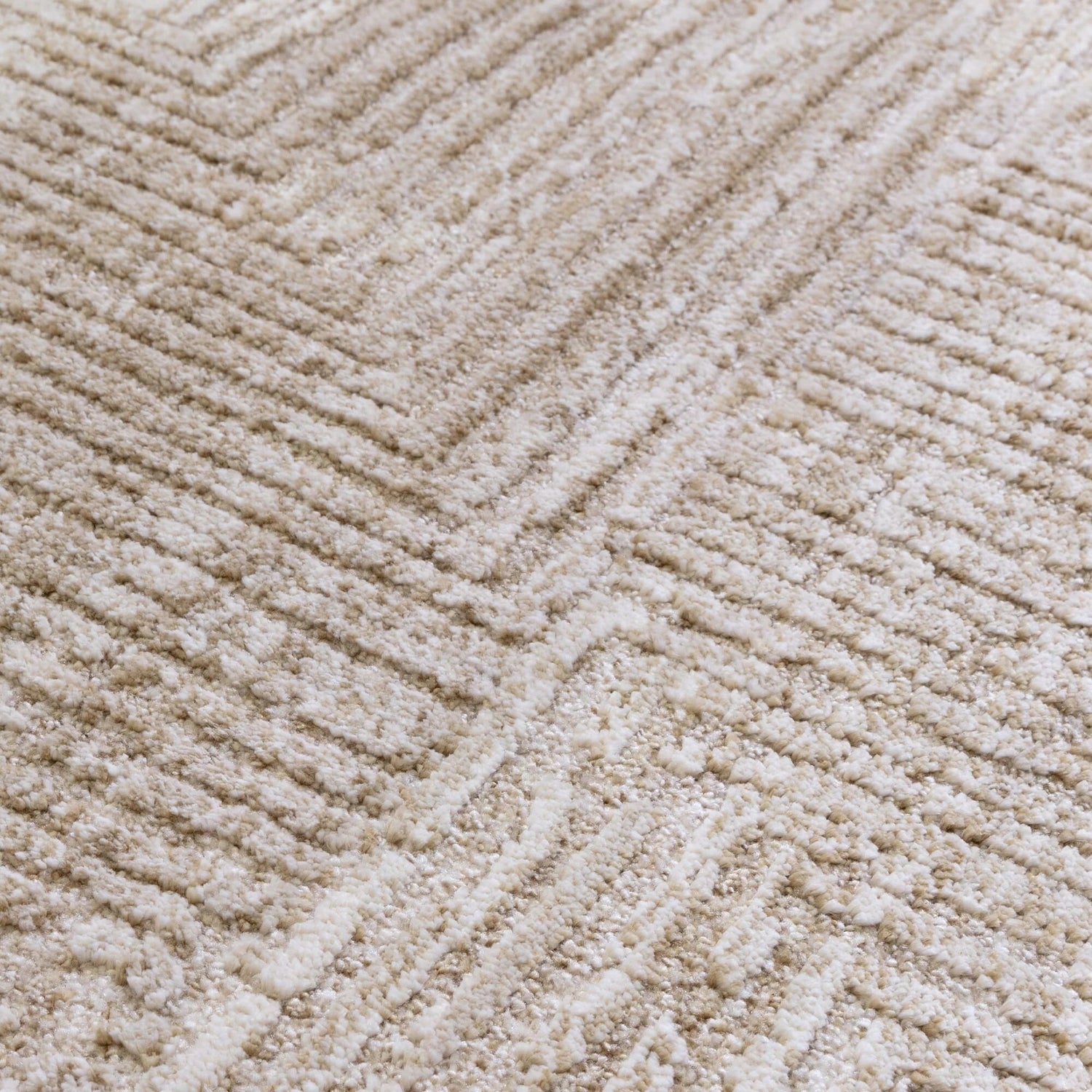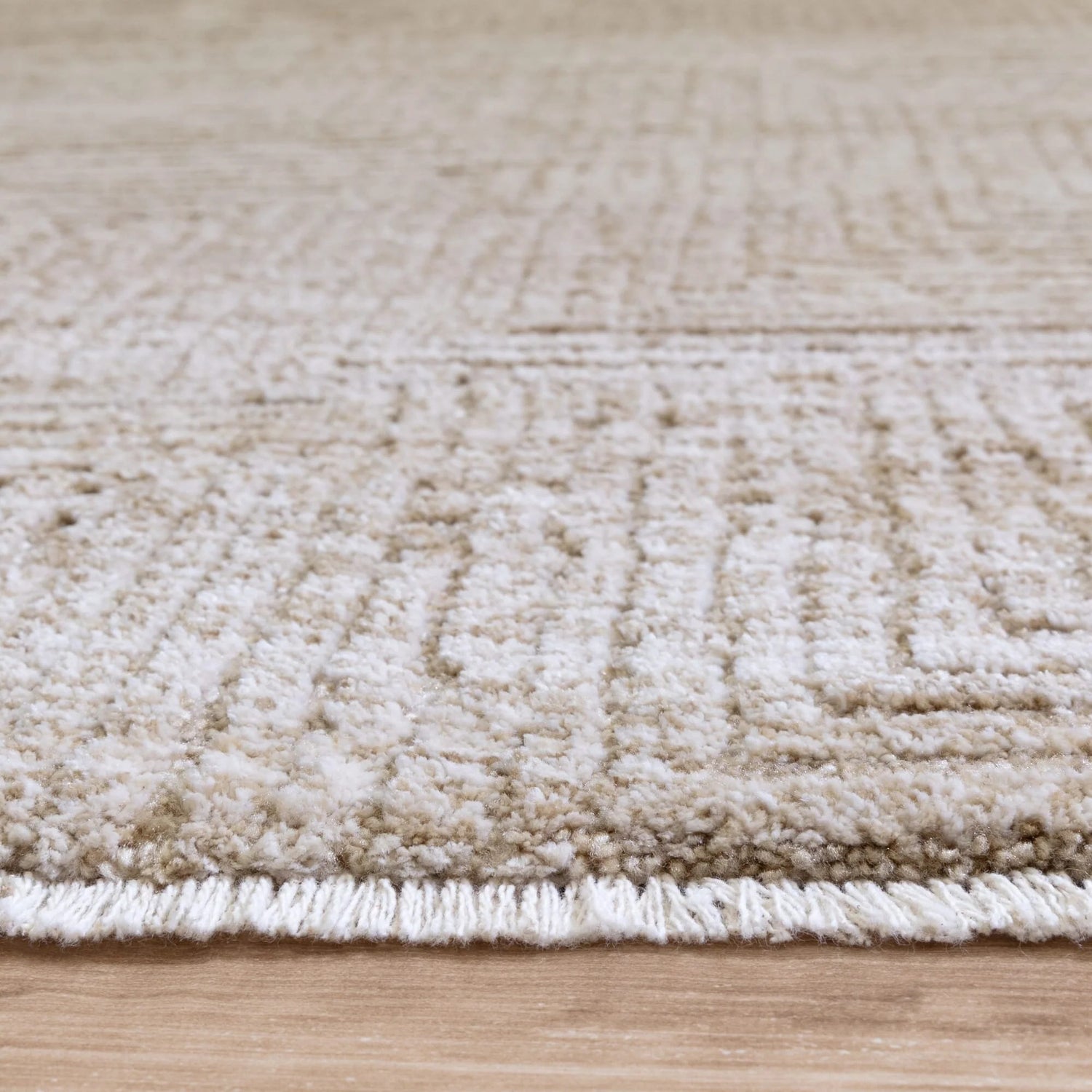Set in a palette of ivory and soft beige, the rug features a repeating stepped motif that creates a sense of gentle movement and understated pattern. The low-contrast colours keep the look light and airy, ideal for enhancing natural light and soft textures.