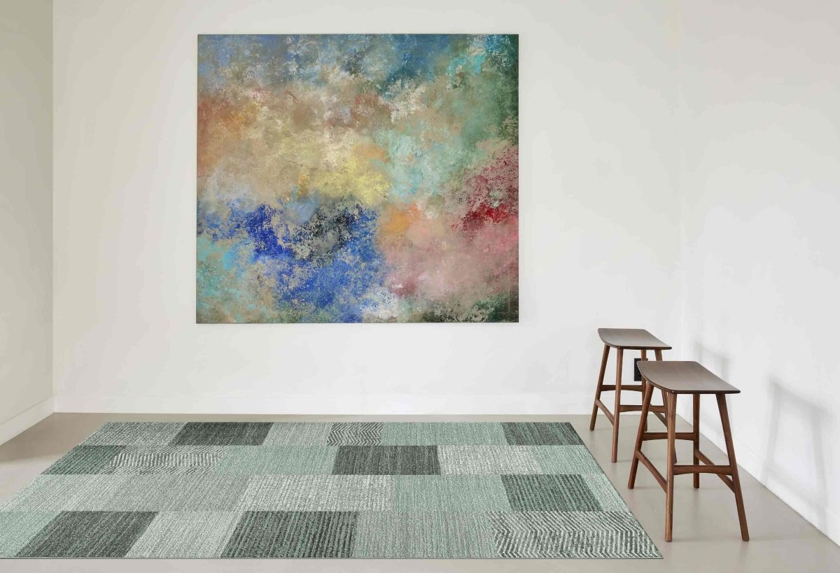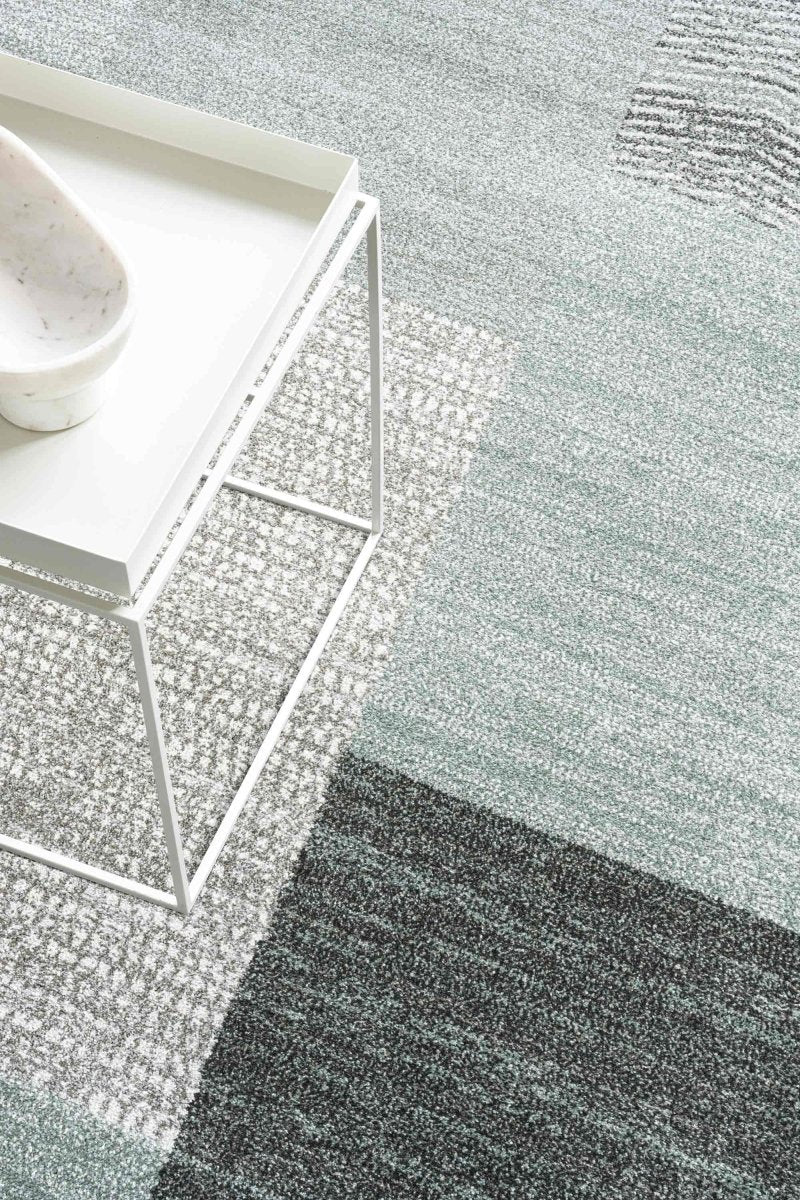 Machine-woven in polypropylene using renewable energy, this rug is an easy fit for living rooms, bedrooms, or home offices. Its cool palette works well with both light and dark furniture, creating a calm, cohesive backdrop for any space.