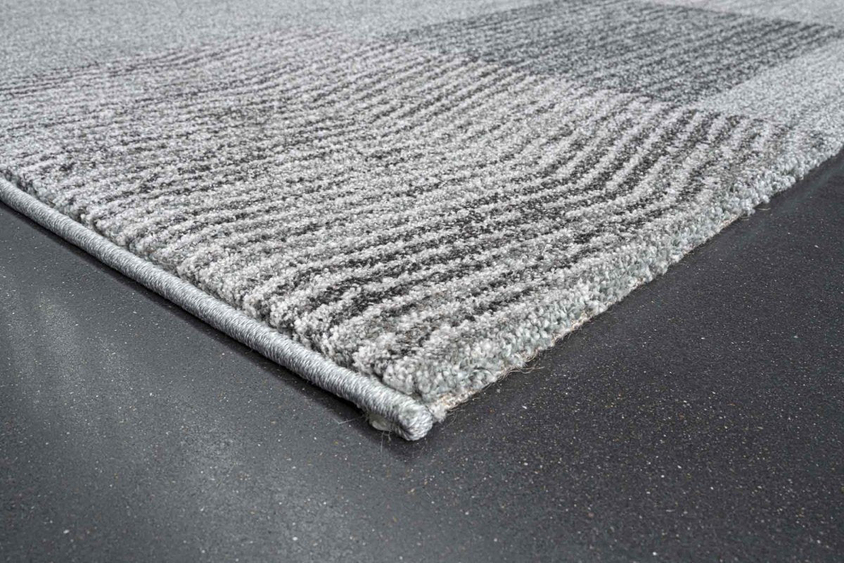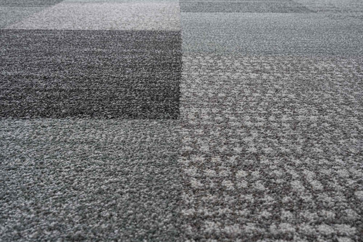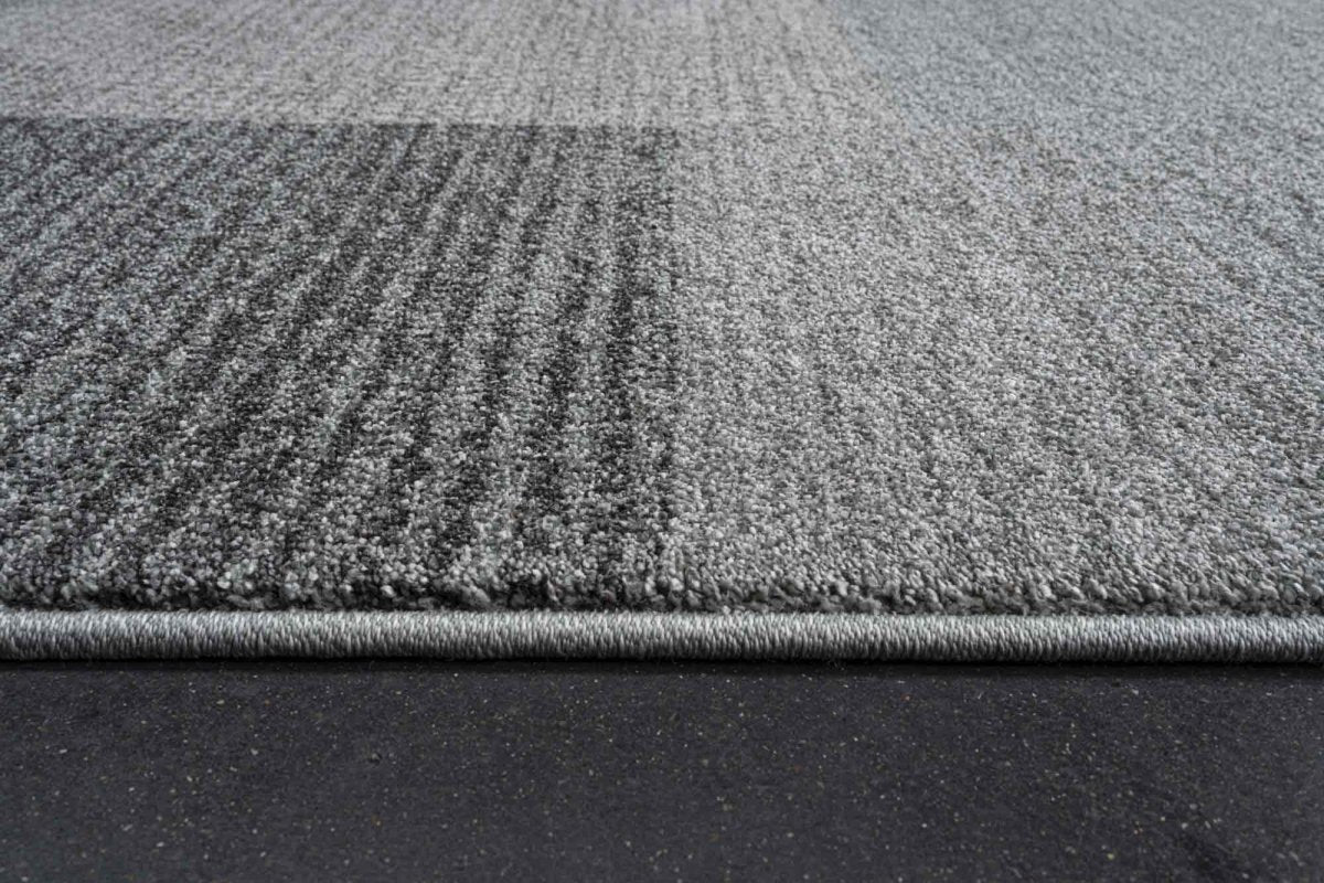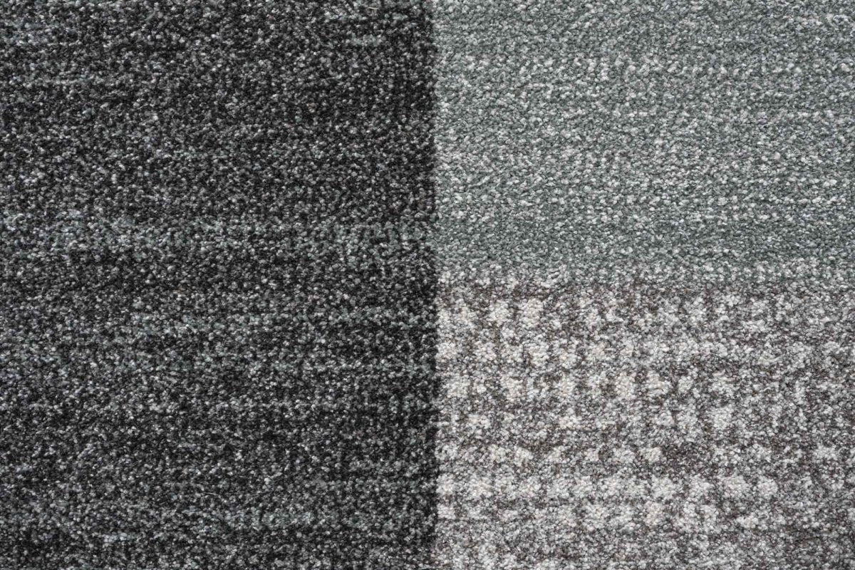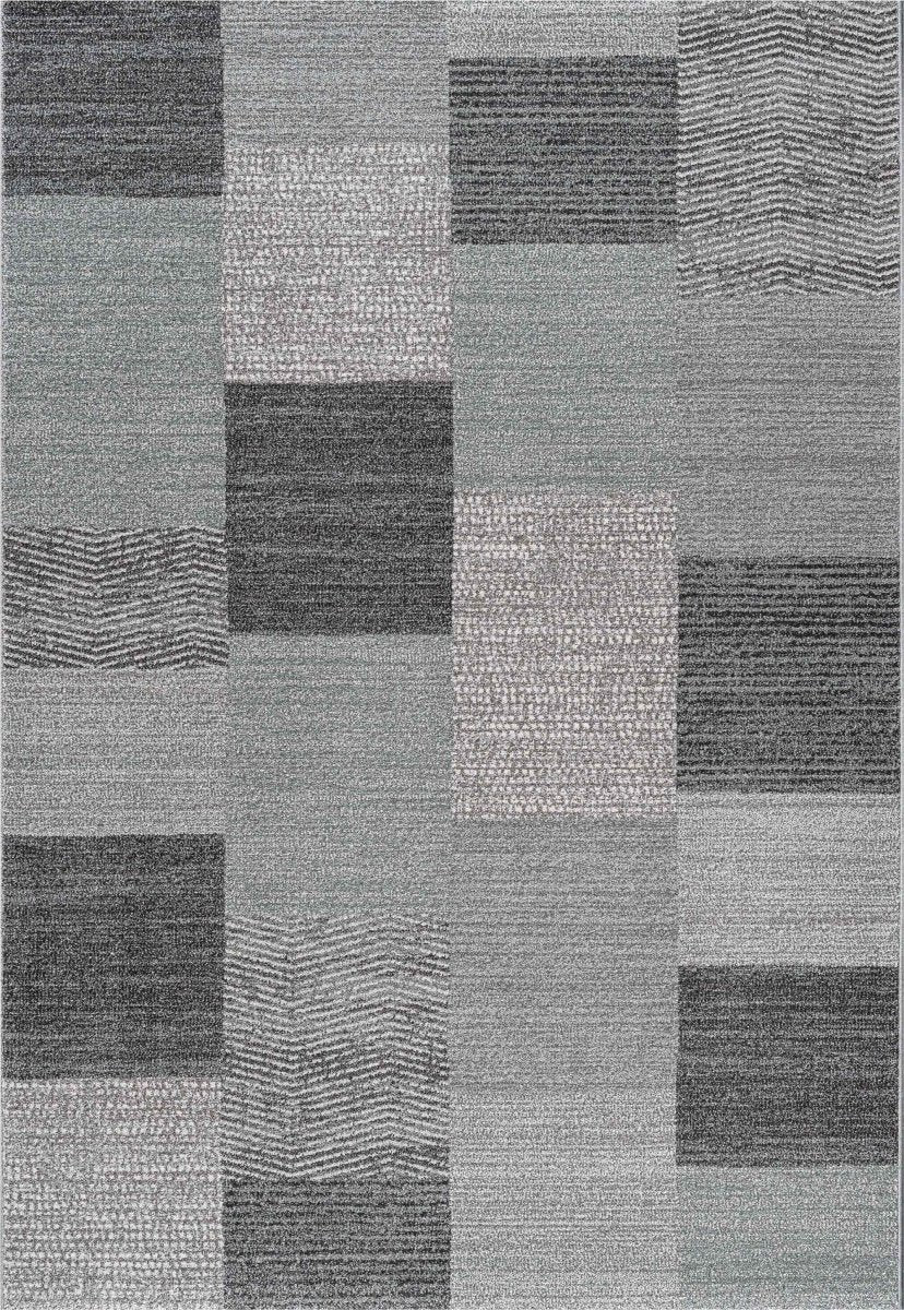 The Liberty 034-0100-4272 Rug features a contemporary patchwork design in soft greys and charcoal tones. Each block showcases a different texture, from chevron lines to dotted and woven effects, giving the rug a subtle depth that suits modern interiors without feeling busy.