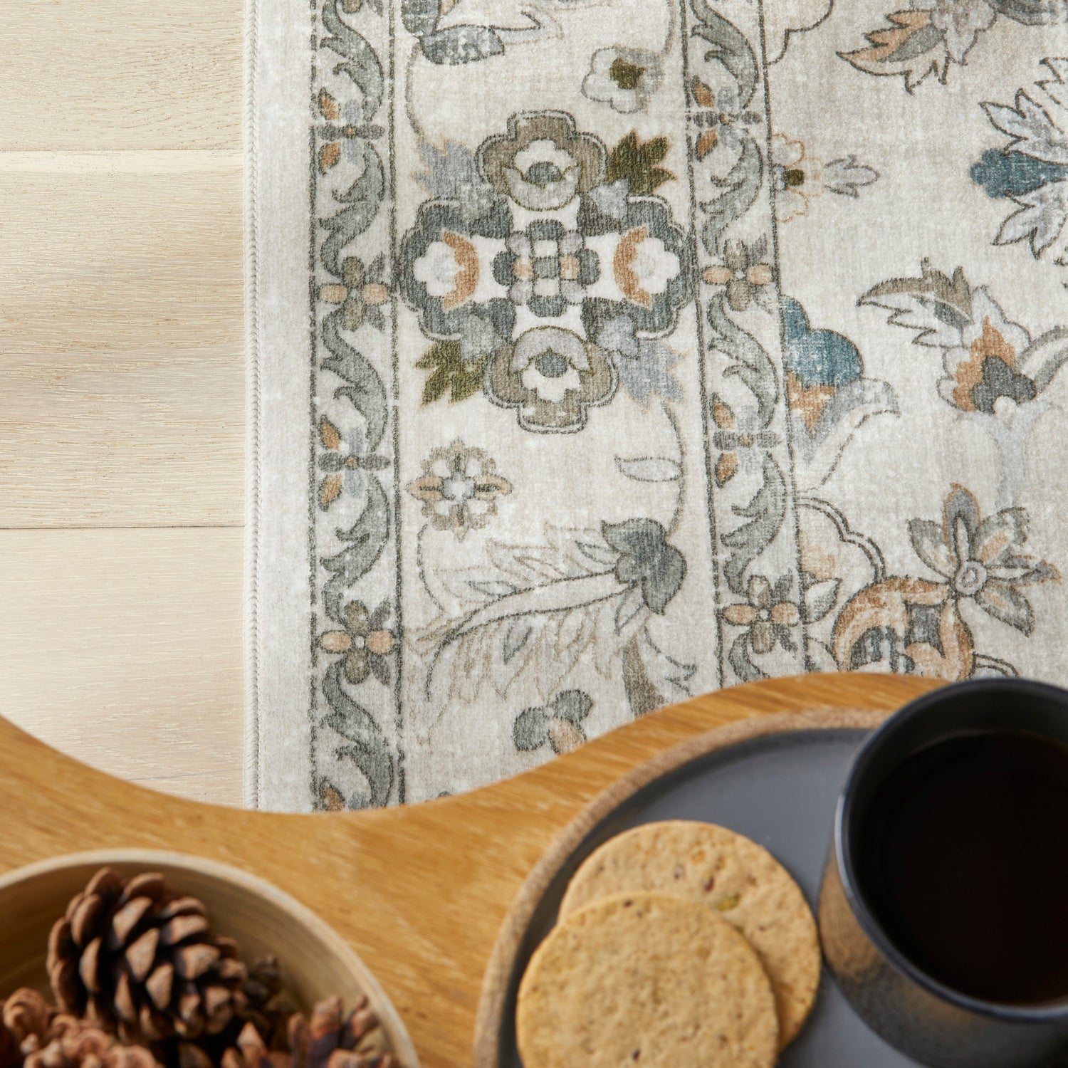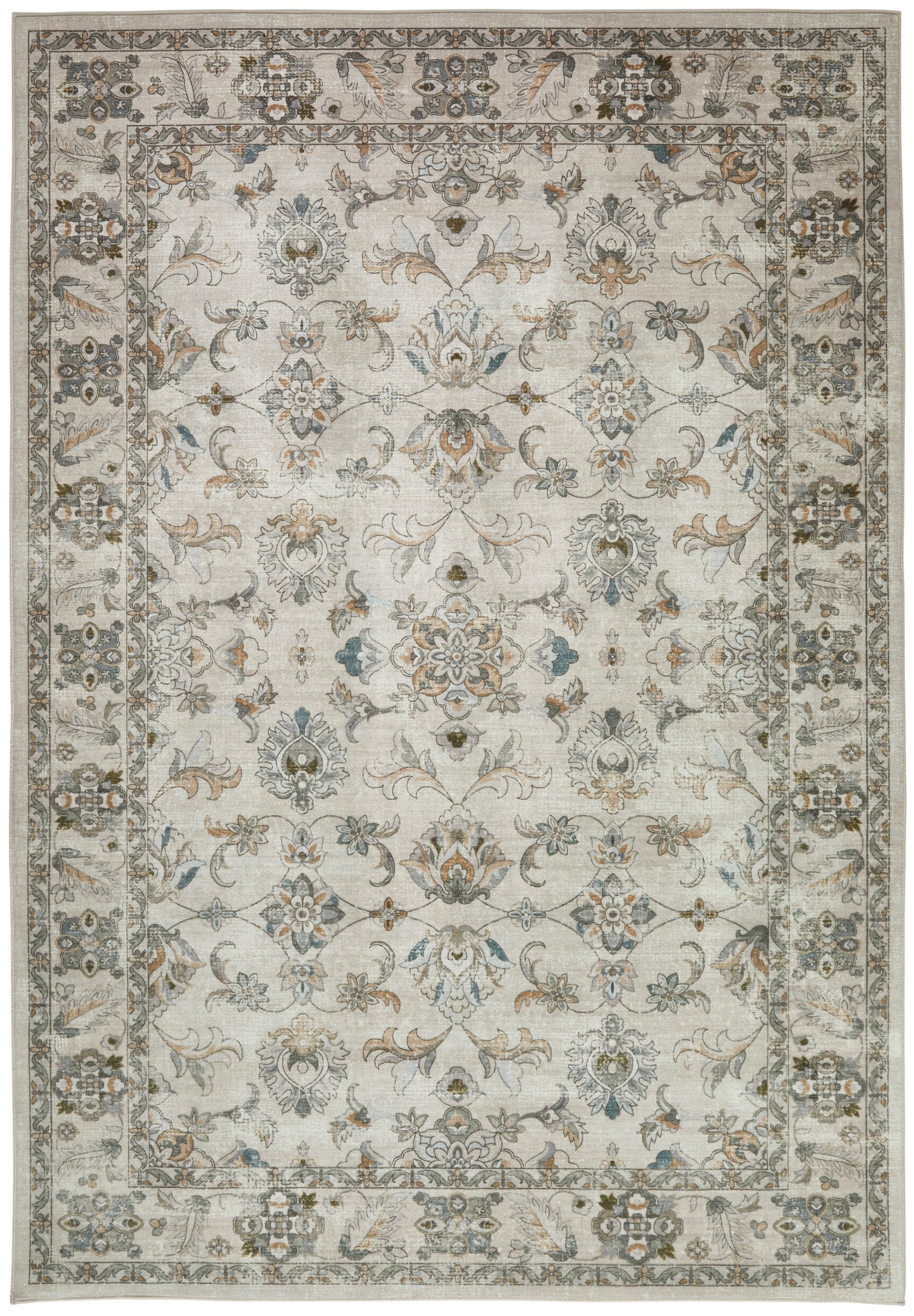 The Liberty Washable LIB204 Taupe Rug combines classic elegance with everyday ease. Its intricate floral and vine pattern unfolds in soft tones of taupe, grey, and muted blue, set against a gently faded ivory base. The design feels timeless and sophisticated, with a subtle vintage texture that adds warmth and depth to any room.