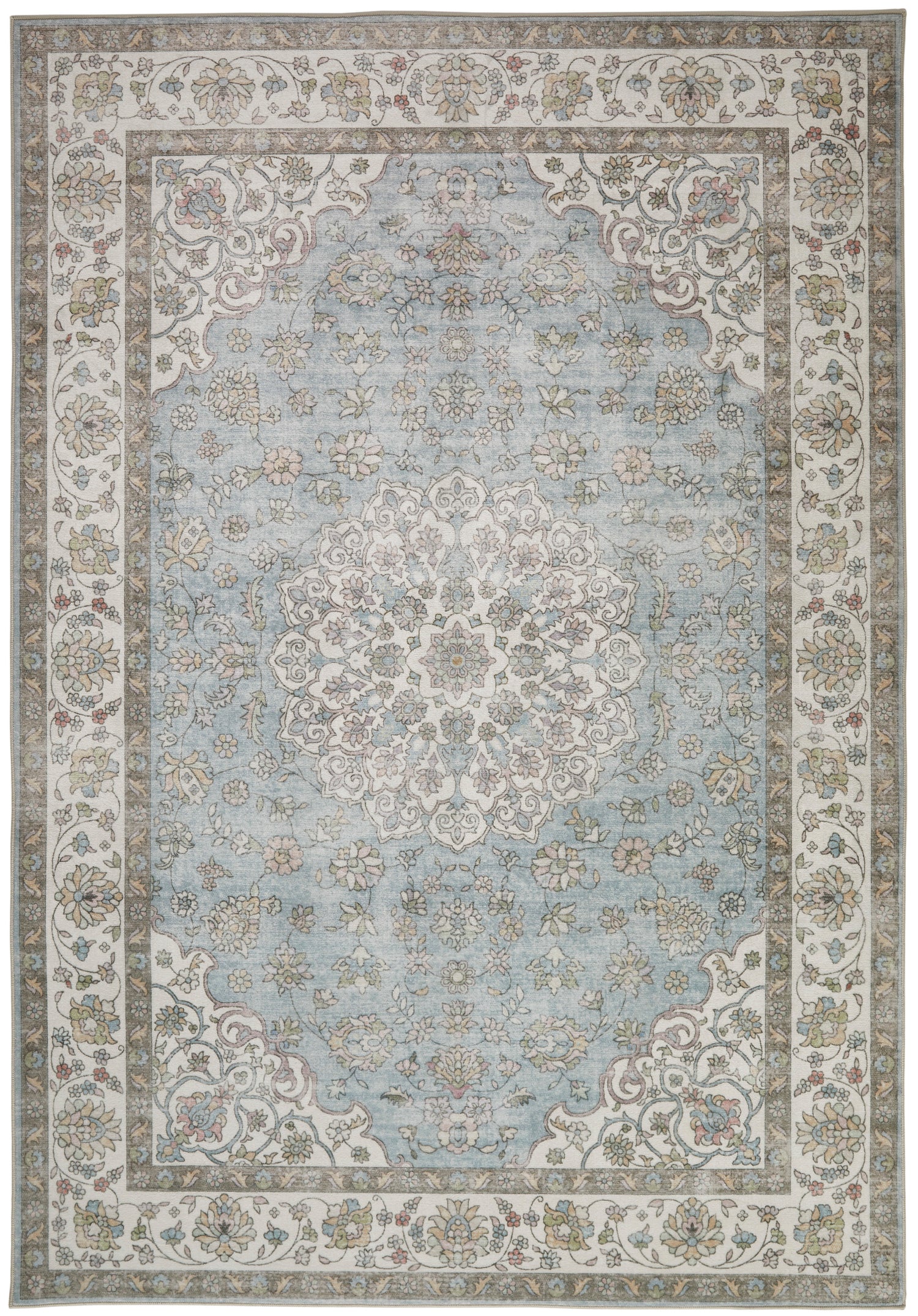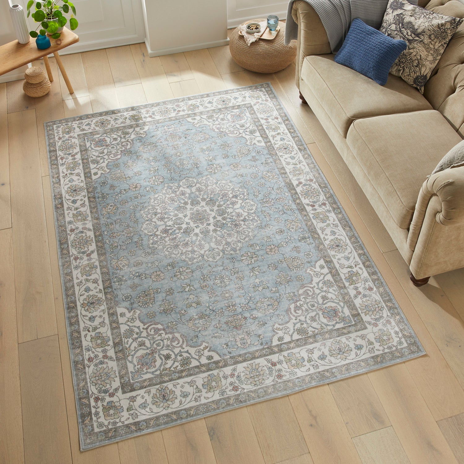 The Liberty Washable LIB206 LTBLU Rug blends timeless design with soothing colour. A detailed central medallion and intricate floral motifs sit beautifully on a washed light-blue background, softened with ivory and hints of sage, blush, and taupe. The delicate patterning and subtly faded look give it a calm, vintage-inspired character that feels effortlessly refined.