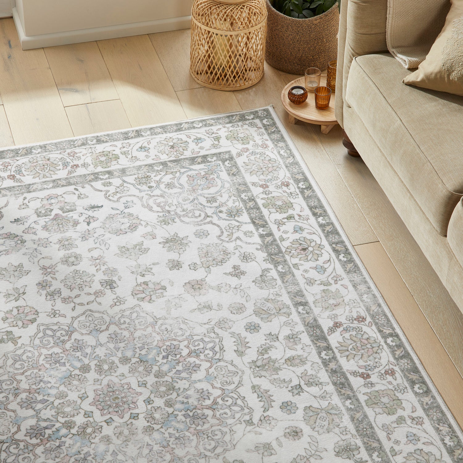 The Liberty Washable LIB209 Ivory Rug captures the beauty of a classic Persian design in a soft, contemporary palette. Its central medallion and floral border are delicately woven in tones of sage, blush, and powder blue on an ivory base, creating an elegant, gently faded effect that feels both traditional and fresh.