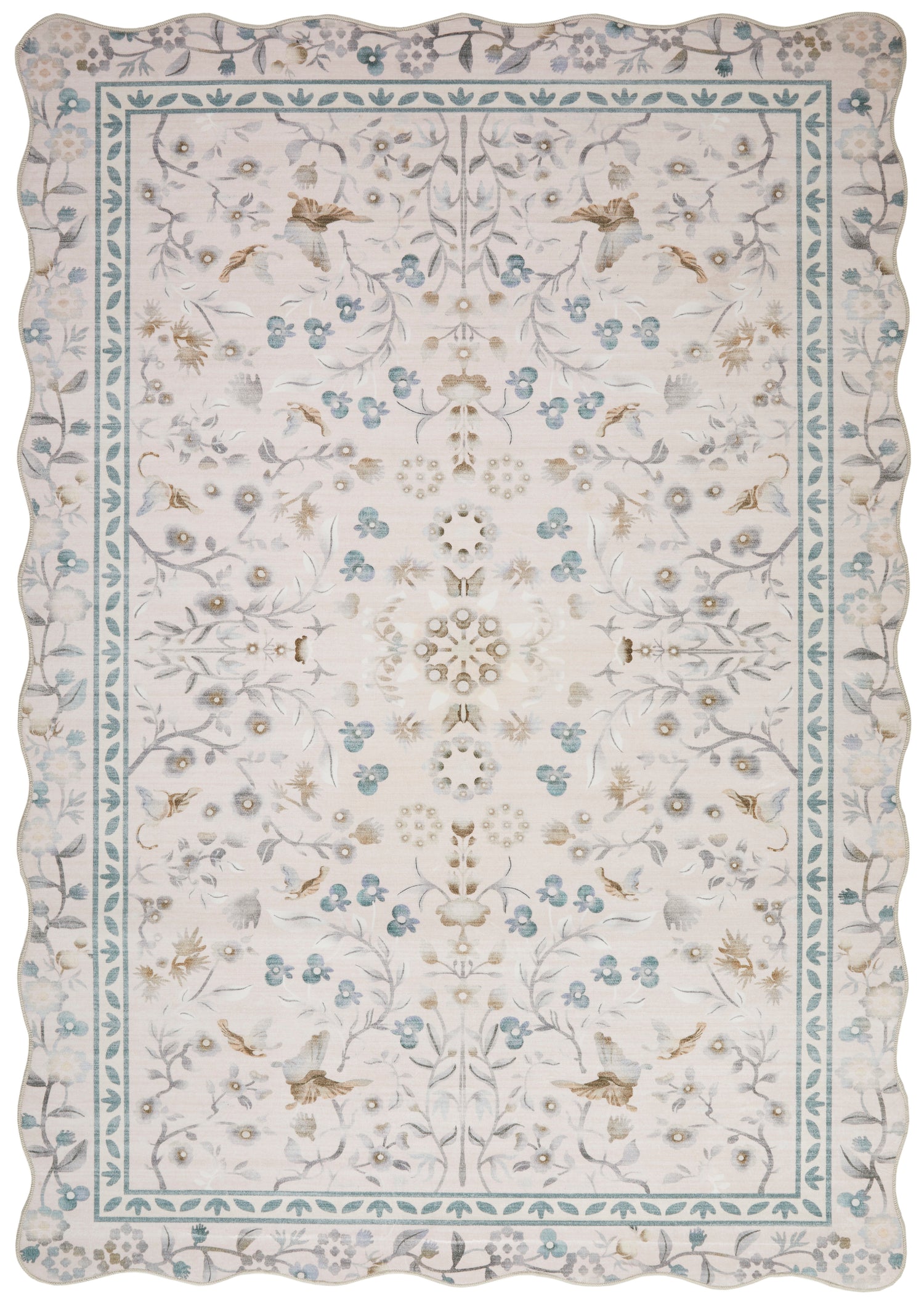 The Liberty Washable LIB305 DUSPK Rug brings a soft, romantic charm to any interior. Its intricate floral design, accented with gentle tones of dusky pink, teal, and warm beige, sits beautifully against a light ivory background. The scalloped border and delicate bird motifs lend a graceful, vintage-inspired feel that’s timeless yet versatile.