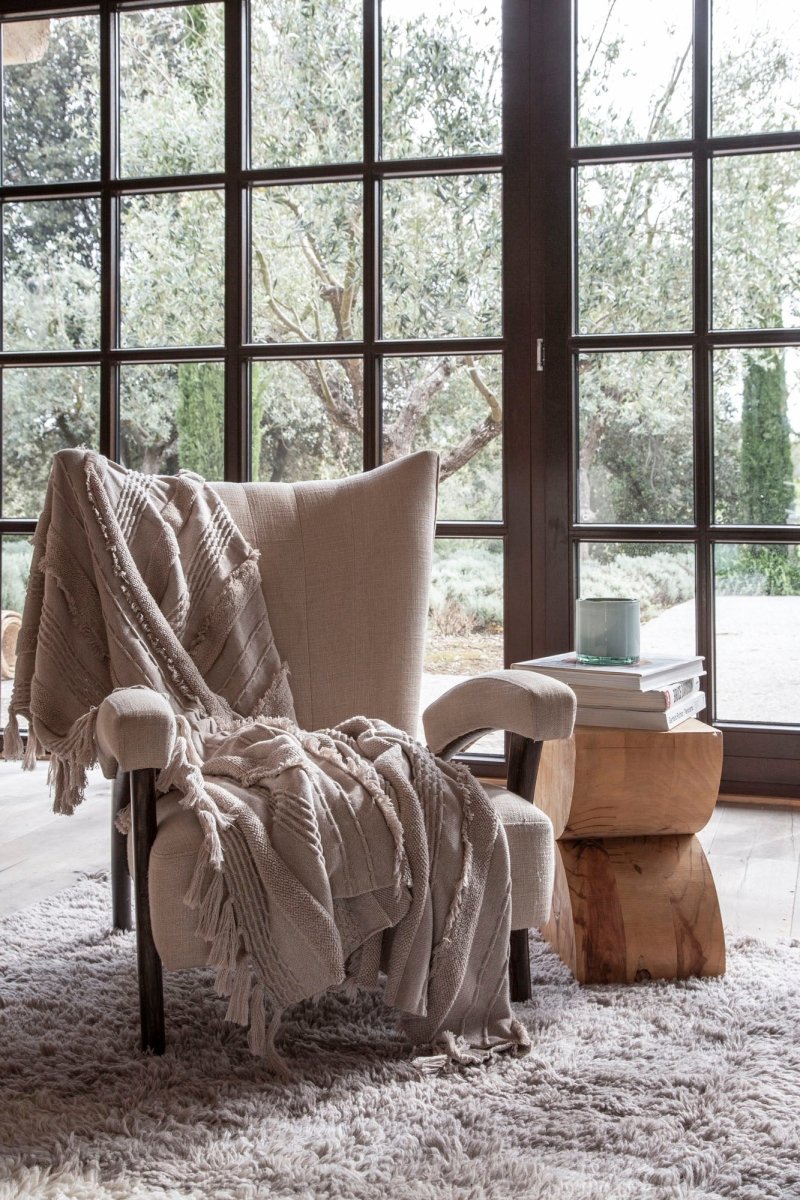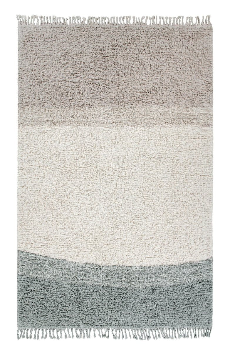 Featuring a gentle gradient of earthy beige, warm ivory, and deep blue-green, this handcrafted rug mirrors the horizon where land meets water, creating a serene and grounding effect. The tousled fringes add an extra touch of organic charm.