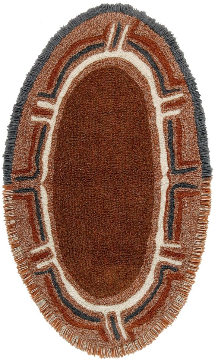 The oval shape and intricate border design in warm earthy tones of terracotta, ivory, and deep grey create a striking visual contrast, reminiscent of African artistry. The soft fringed edges enhance its handcrafted charm, making it a unique statement piece.