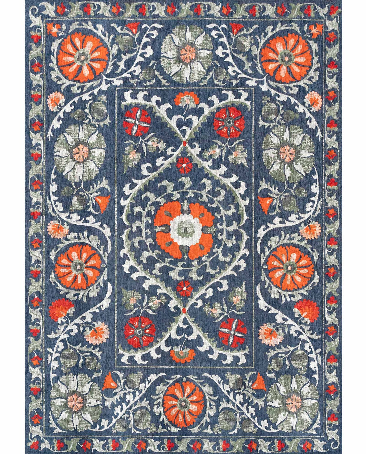 The Louis De Poortere Antiquarian Suzani 9730 Nordic Rug is a bold and captivating interpretation of traditional Suzani embroidery, featuring intricate floral and vine motifs set against a striking deep navy background.