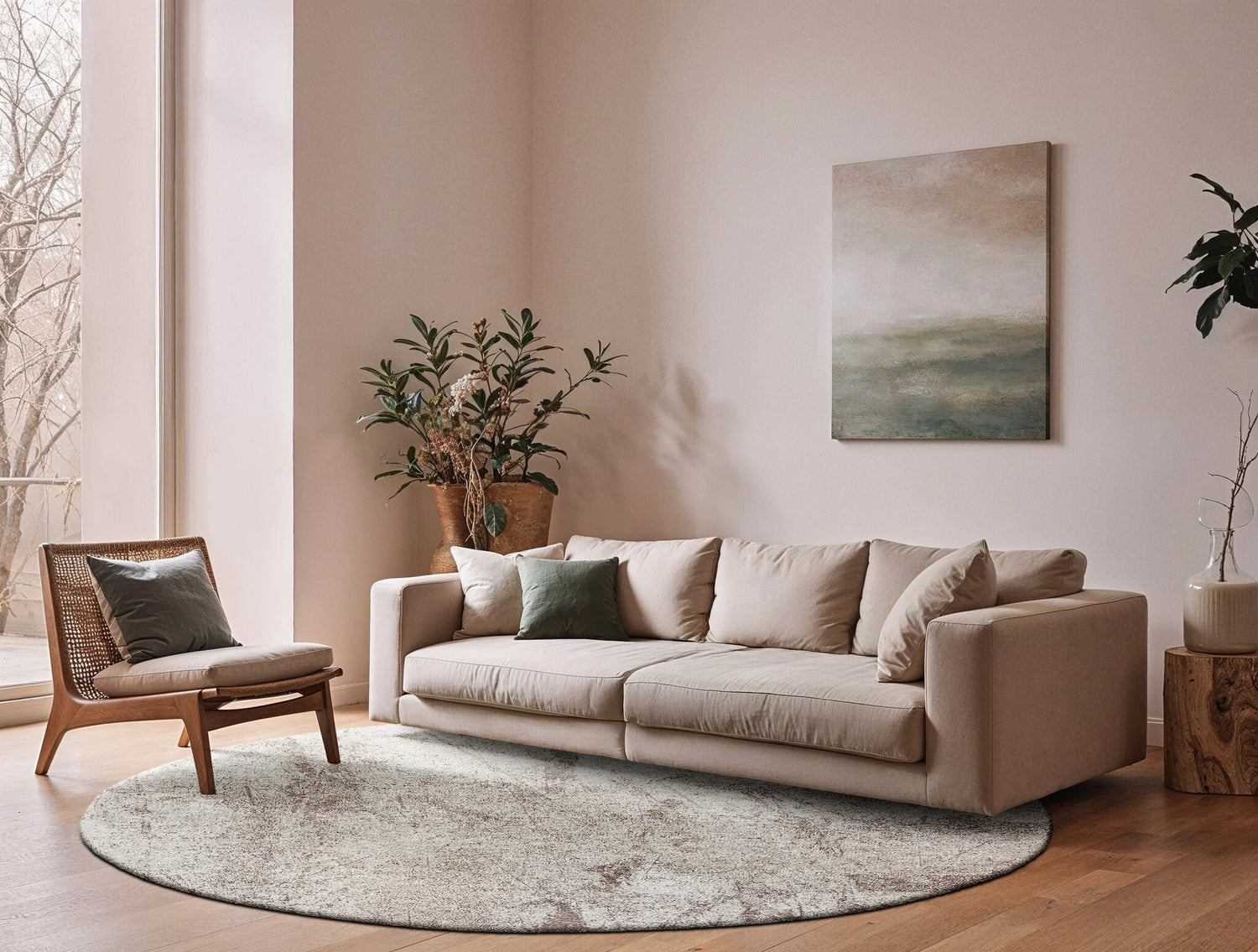 The Louis De Poortere Mad Men Sol 9735 Albatre Round Rug exudes quiet sophistication with its soft beige and ivory tones, inspired by the natural elegance of alabaster stone.