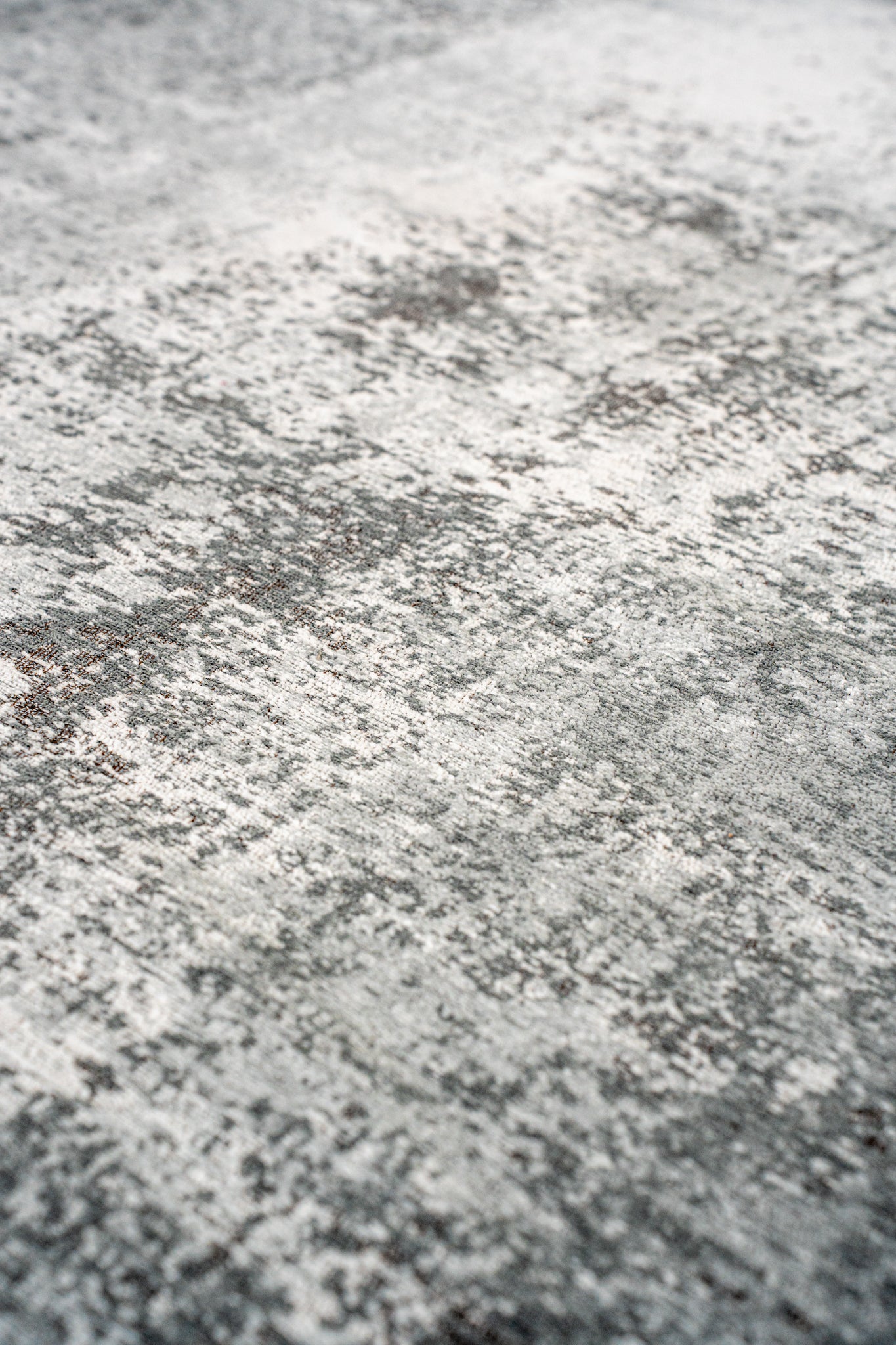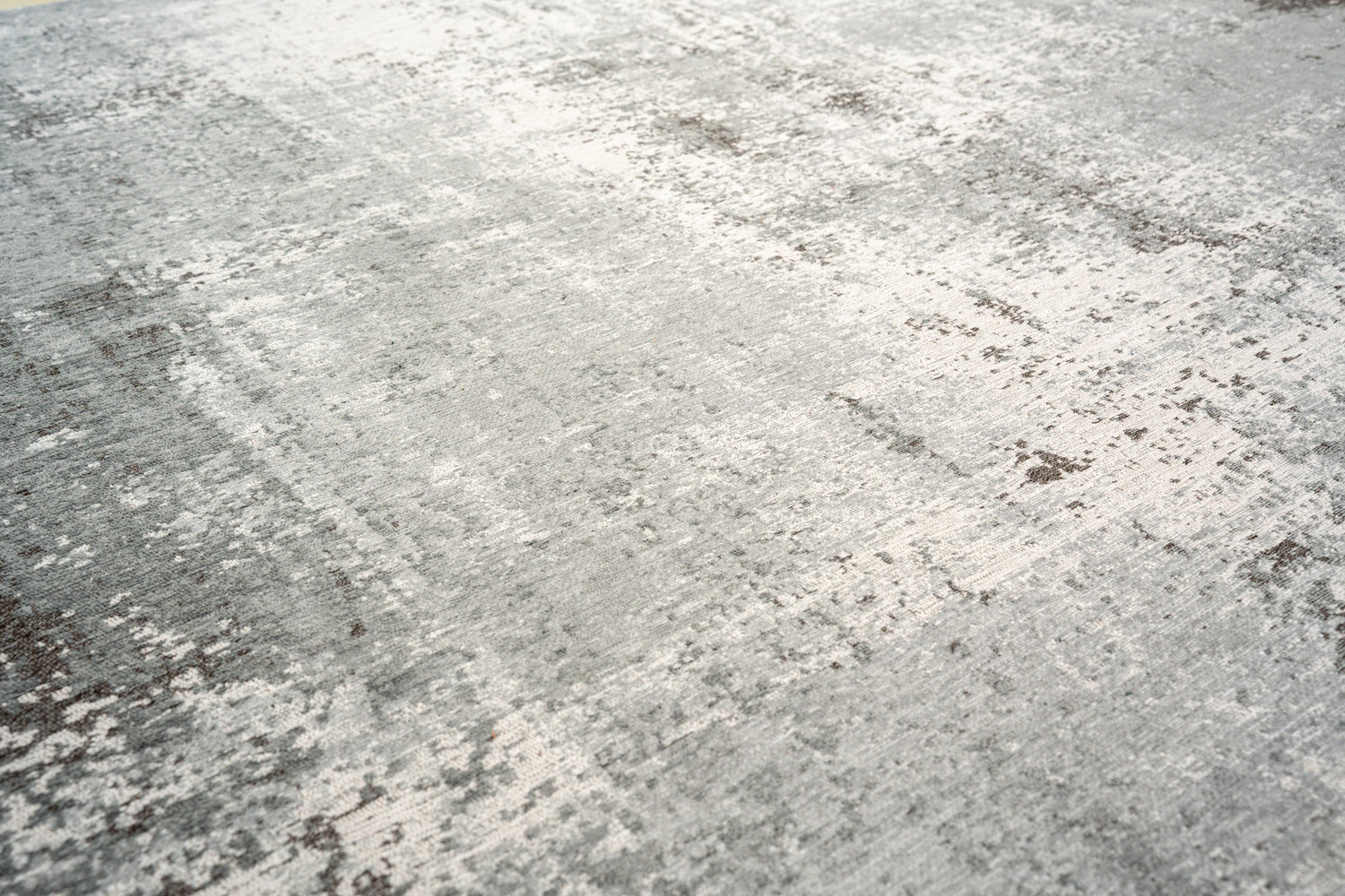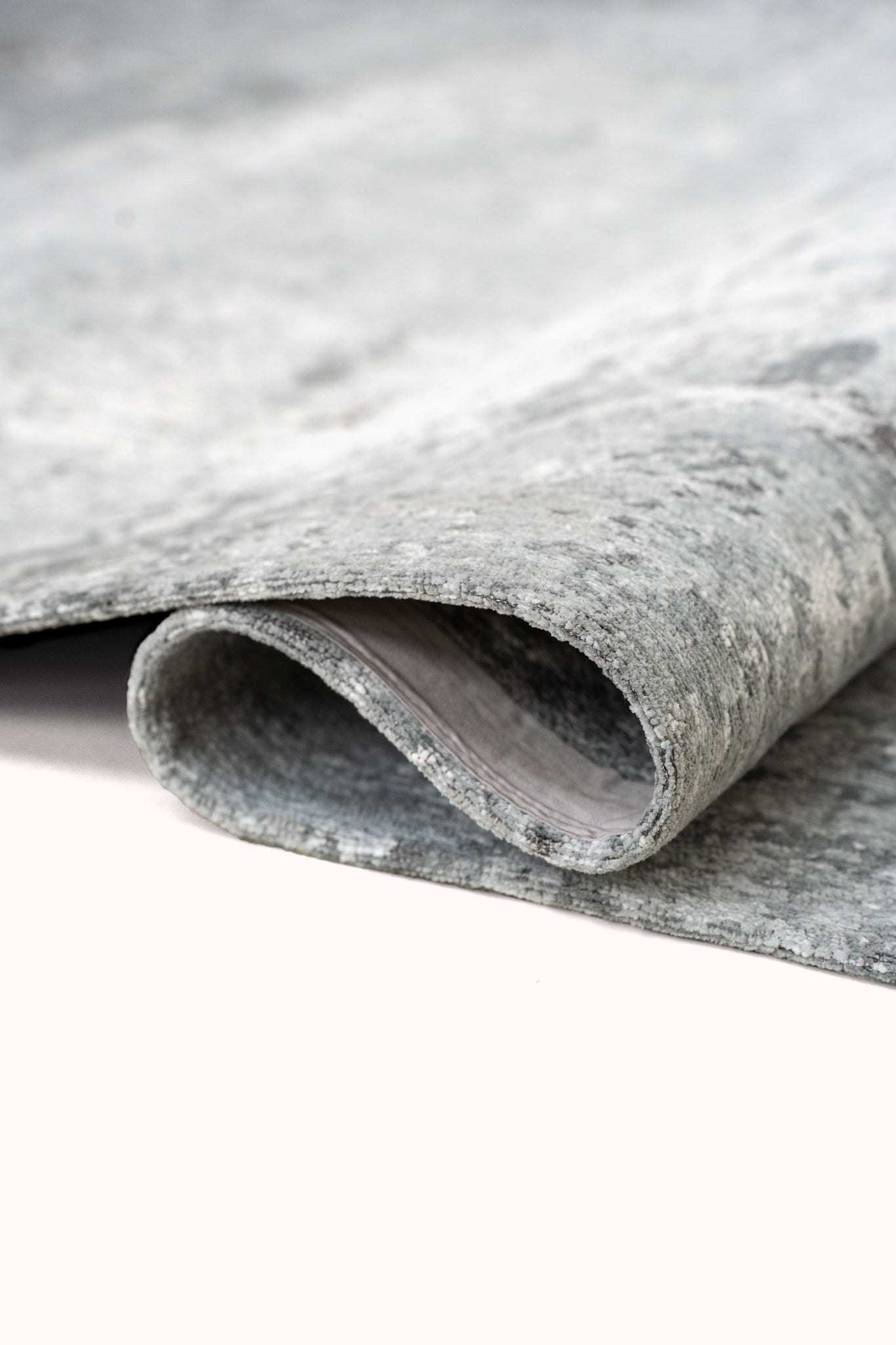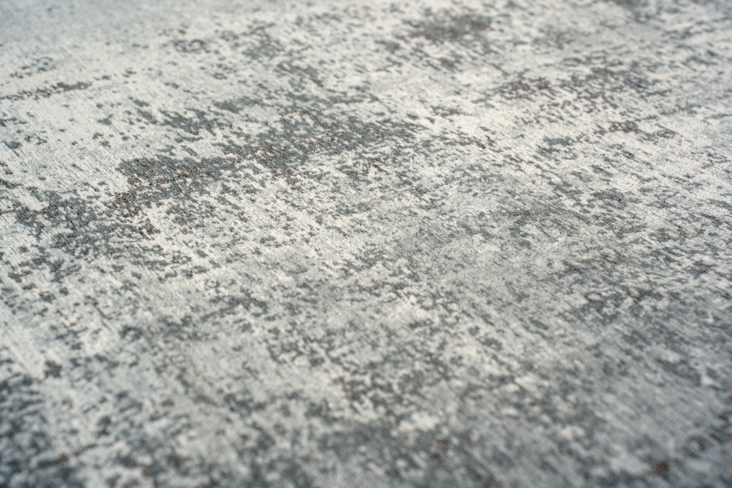 Its distressed design mimics the natural textures of planetary landscapes, creating a beautifully layered effect. The soft silver-grey base, blended with deep charcoal and hints of off-white, evokes the misty, atmospheric tones of Venus, making this rug a sophisticated yet understated statement piece.
