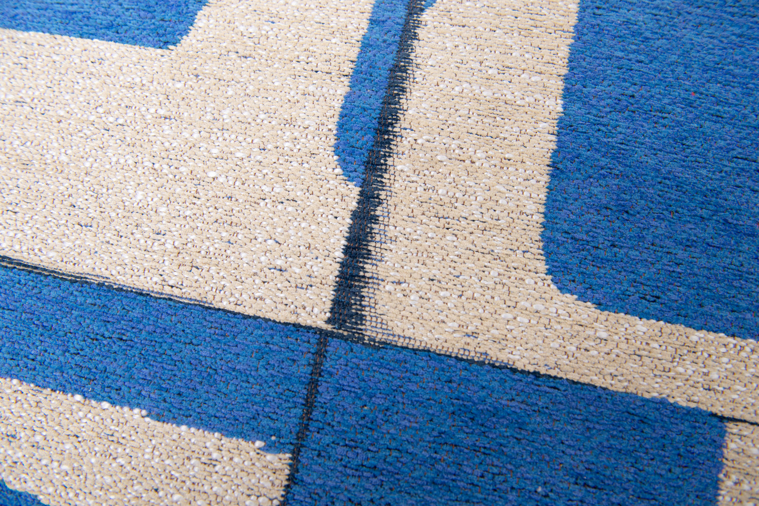 The Papercut pattern features bold, cut-out shapes in vivid blue and crisp ivory, arranged in a collage-like composition that evokes the playful and dynamic energy of modern art.